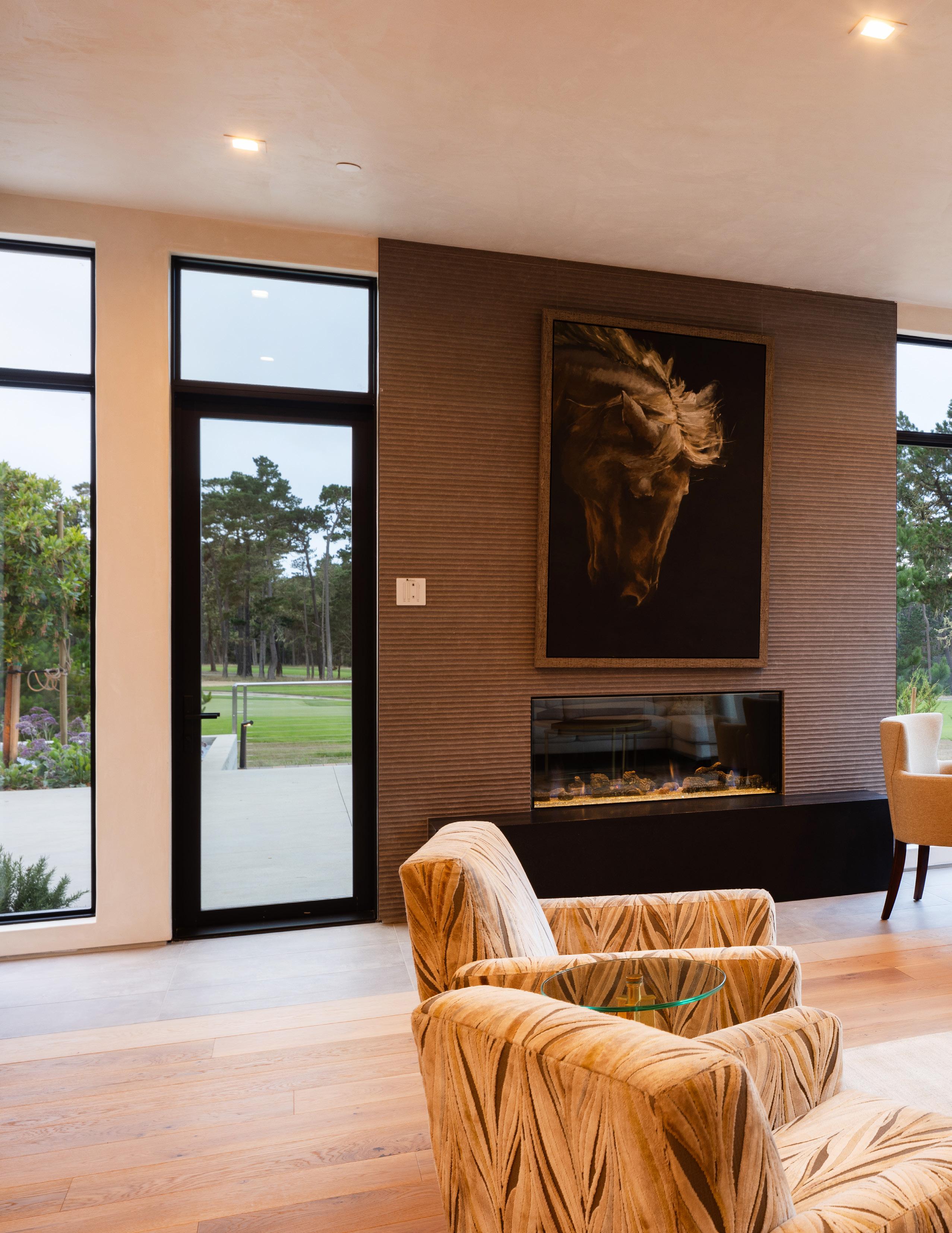 • Three-sided peninsula fireplace in living room and separate porcelain-veneered fireplace in family room