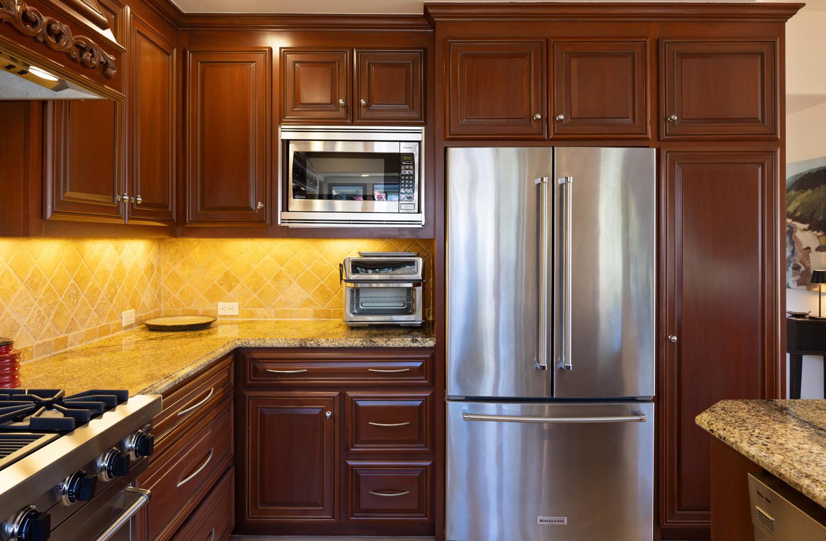 • Custom built TV storage niche with antique (1800’s French Walnut) doors