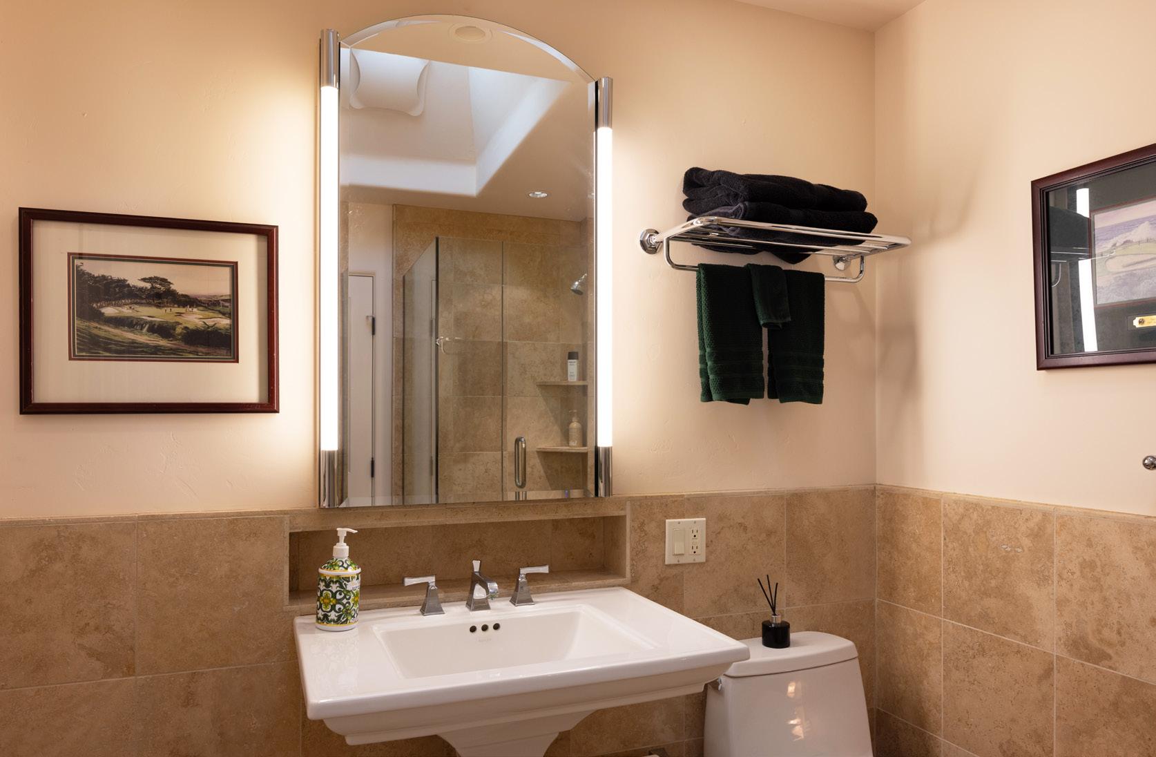ű Guest bath has small built in dresser with mirrored niche, glass shelving and extra electrical outlets