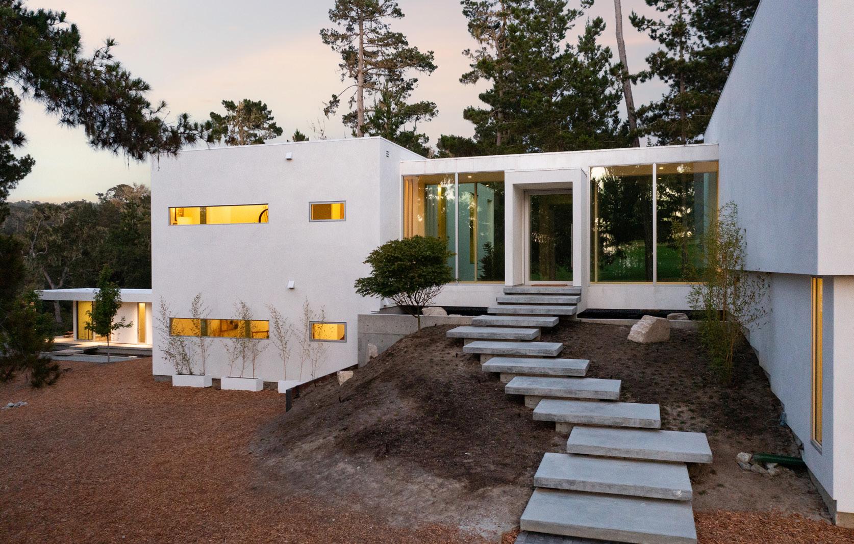 With sweeping views of Spyglass Hill’s 11th fairway and filtered ocean vistas, the Waterbridge House is an extraordinary estate thoughtfully designed with Scandinavian-Japanese minimalism. This newly constructed compound is comprised of the stunning main house, a private ADU, and a Tea House (Guest House) floating on water. The architecturally significant estate embraces clean lines, symmetry, and intentional simplicity, blending timeless natural elements with modern form. Two architectural axes—interior and exterior—guide you through spaces that reveal and conceal, including the “Waterbridge,” a glazed walkway over a tranquil pond. The sculptural “Cloud Steps” lead to a lightfilled interior where polished concrete floors, Western floor-to-ceiling windows, Italian concealed Infinity doors, and Poliform cabinetry define quiet luxury. Sustainability meets sophistication with triple-glazed windows, an airtight façade, radiant heat, and an automated energy recovery system. From SubZero, Wolf, and Miele appliances to Italian Flos lighting and Simply White plaster walls, every detail reflects enduring craftsmanship and environmental mindfulness. Located in the heart of Pebble Beach near The Lodge and by the Spyglass Club House, Waterbridge House is a half mile to the beach and just a short drive from all the wonderful amenities of Carmel, Big Sur, and the entire Monterey Peninsula. This Pebble Beach masterpiece is ready to welcome home its fortunate new owners.