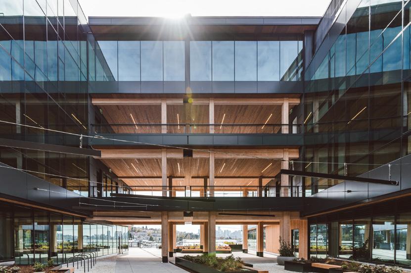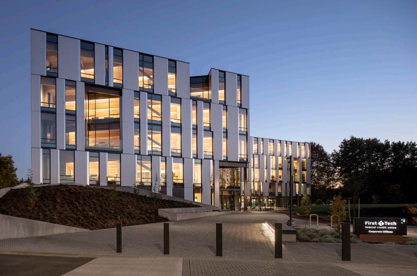 First Tech Credit Union, a five-story 156,000-squarefoot office headquarters in Hillsboro, Oregon, was our team’s first mass timber project—delivered by Swinerton Builders—and for a while, it was the largest mass timber building in America. The building’s design prioritizes natural light while also providing ample open space to benefit health and well-being.
