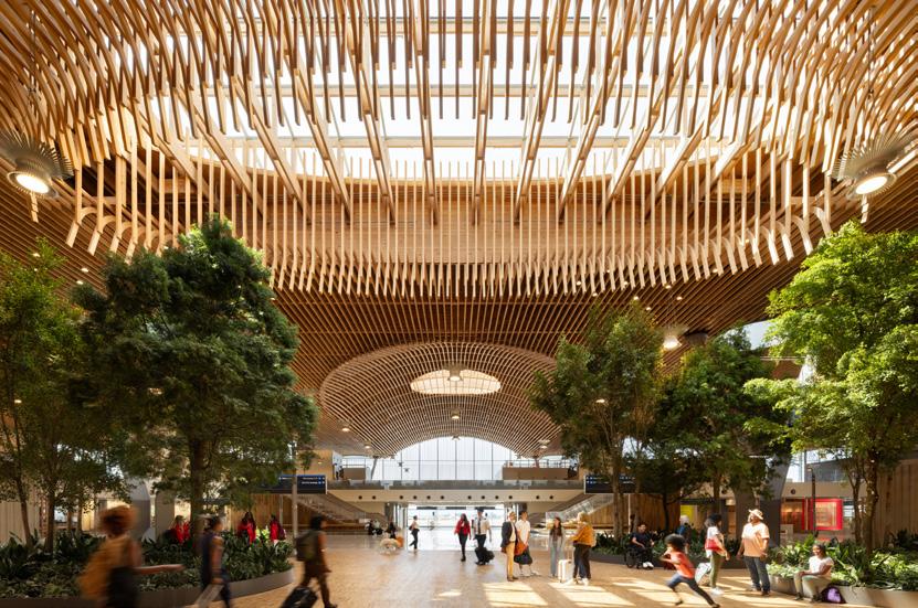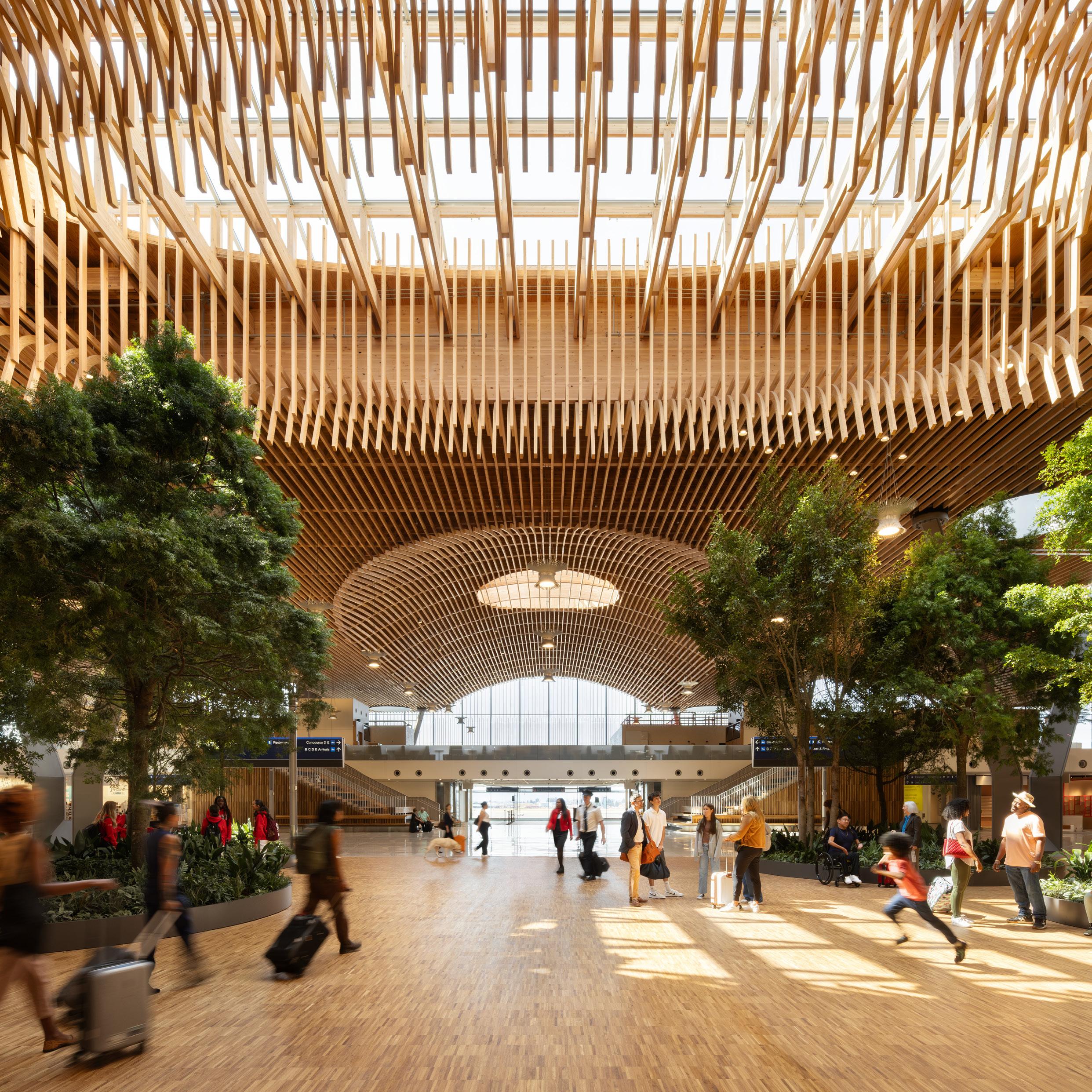 The centerpiece of the PDX Terminal Core Redevelopment is a stunning, 400,000-square-foot timber roof that highlights the region’s innovation in mass timber. Comprised of approximately 3.3 million board feet Douglas Fir, the roof features over 400 80-foot glulam arches and mass plywood panels for the roof diaphragm and skylight curbs.