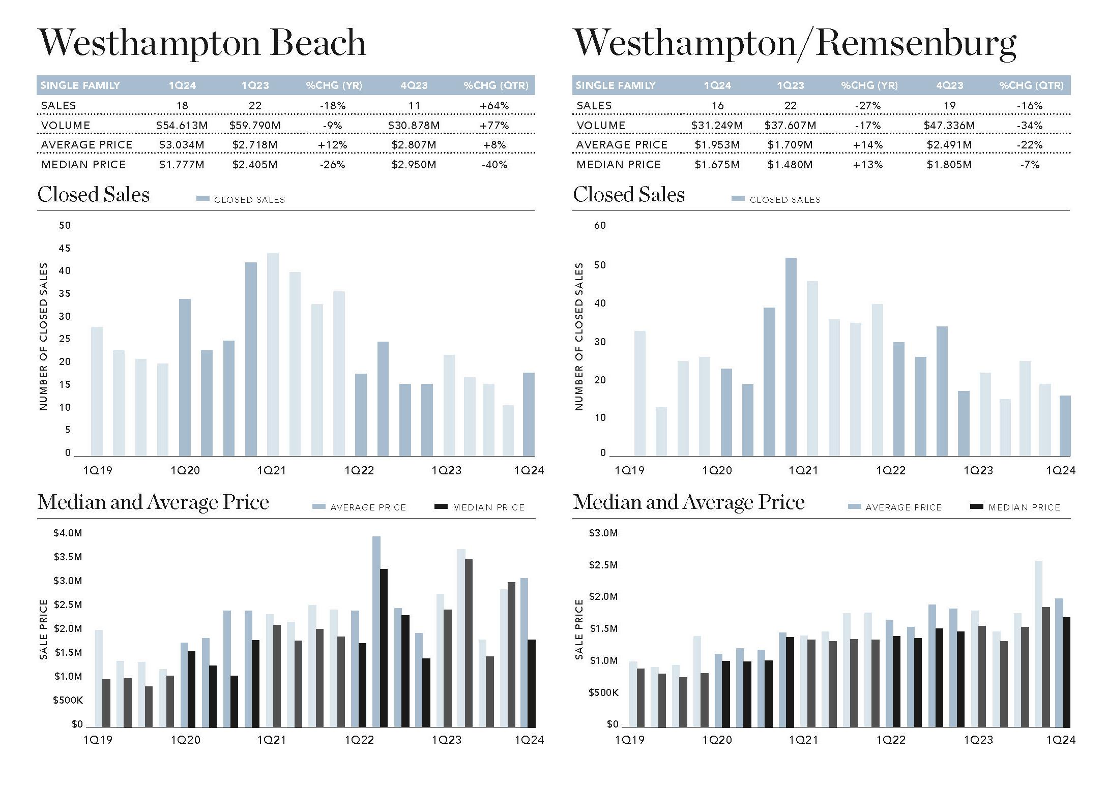 All but four of the fourteen analyzed South Fork villages and hamlets displayed a decrease in closings versus a year ago. Eleven submarkets had doubledigit annual drops. Notably, Southampton had the most significant percentage drop in sales, down 45% versus First Quarter 2023, a difference of twenty-five closings. On the other hand, Quogue and Amagansett increased by 50% and 45%, respectively.