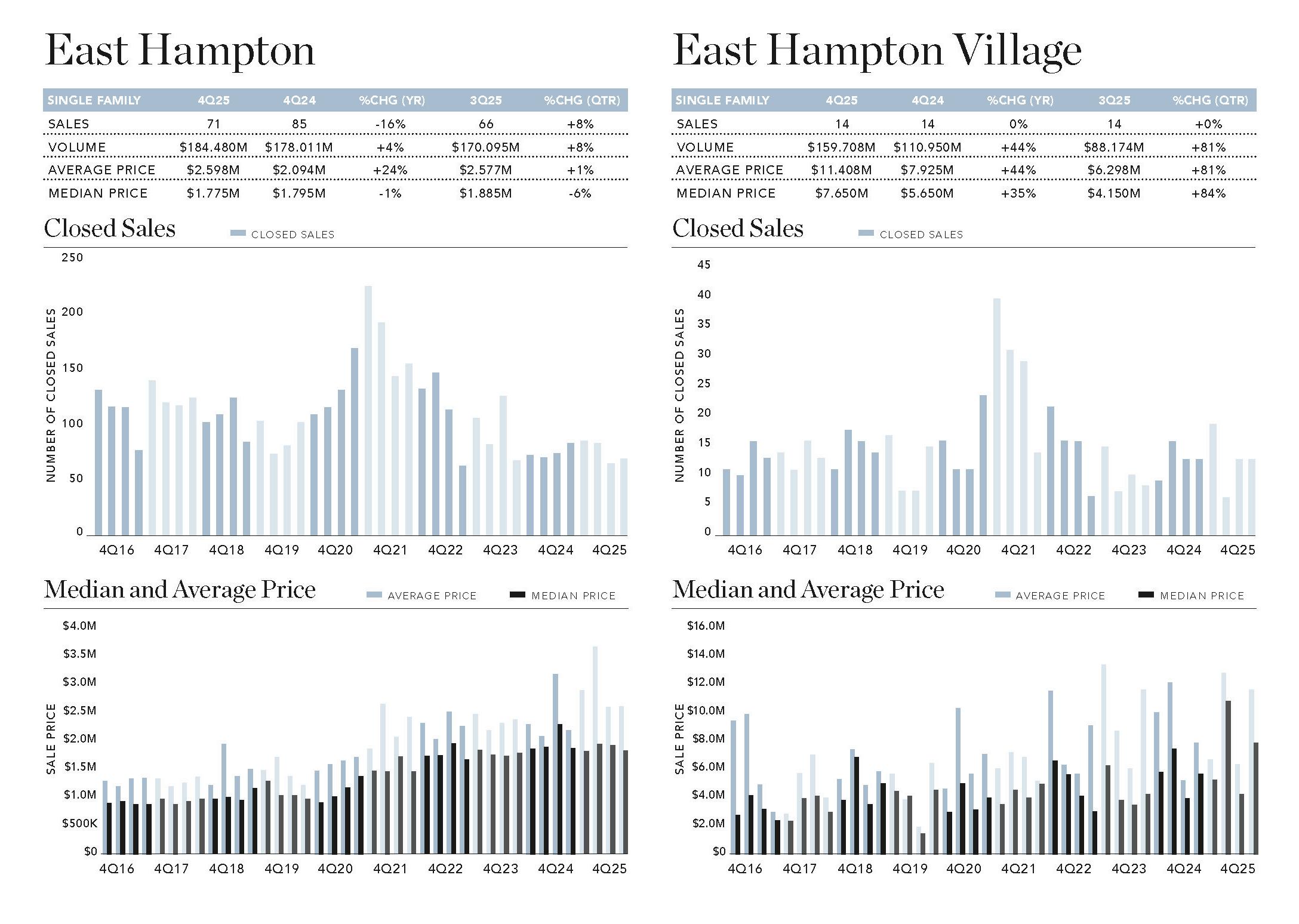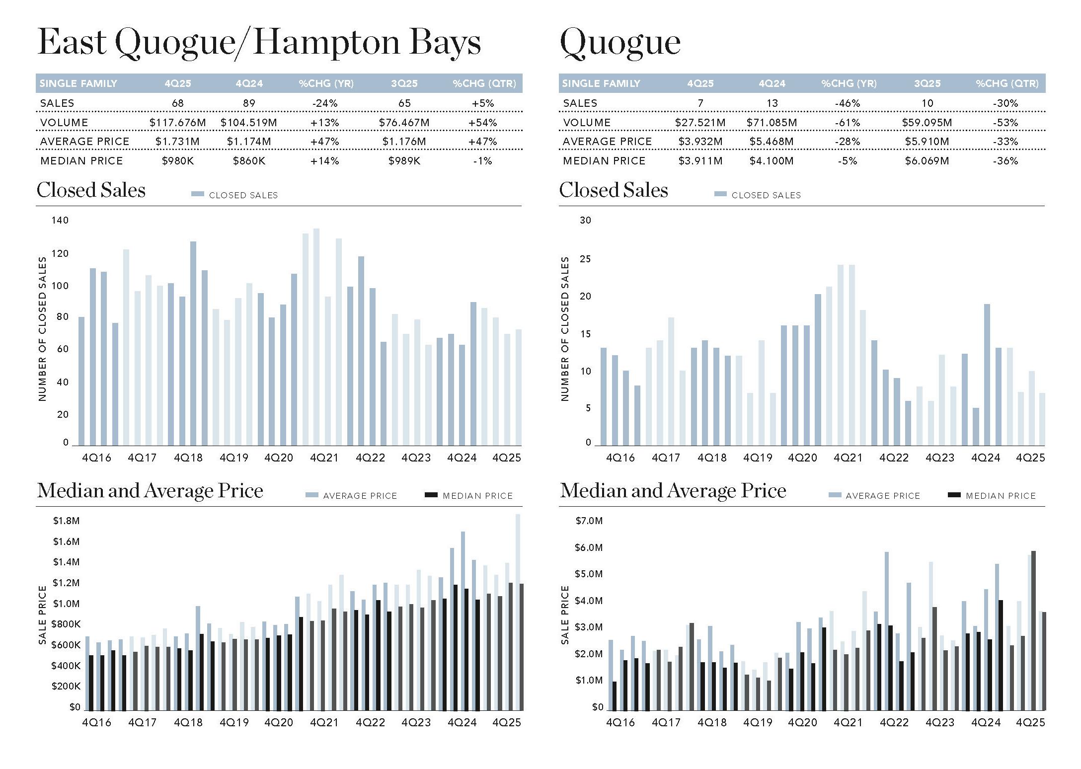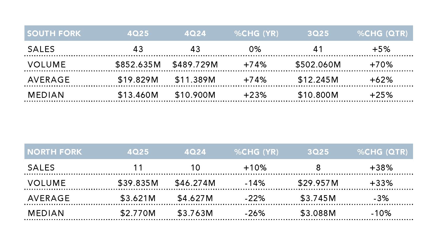 The South Fork reported 434 single-family home sales in Fourth Quarter 2025, the same number of closings reported a year before. This was the fifth consecutive quarter without a year-over-year decline in reported activity, which has not happened since 2021.