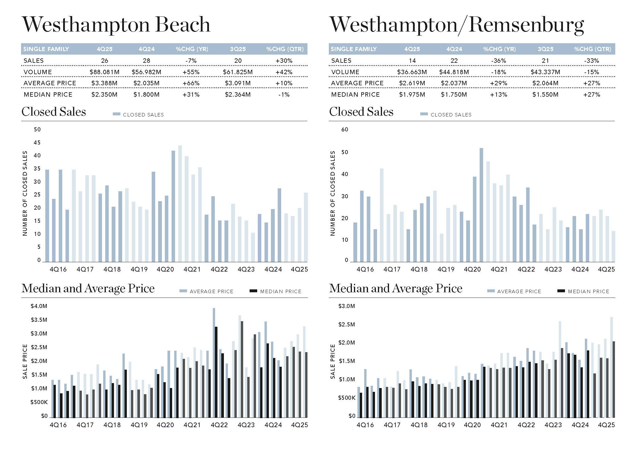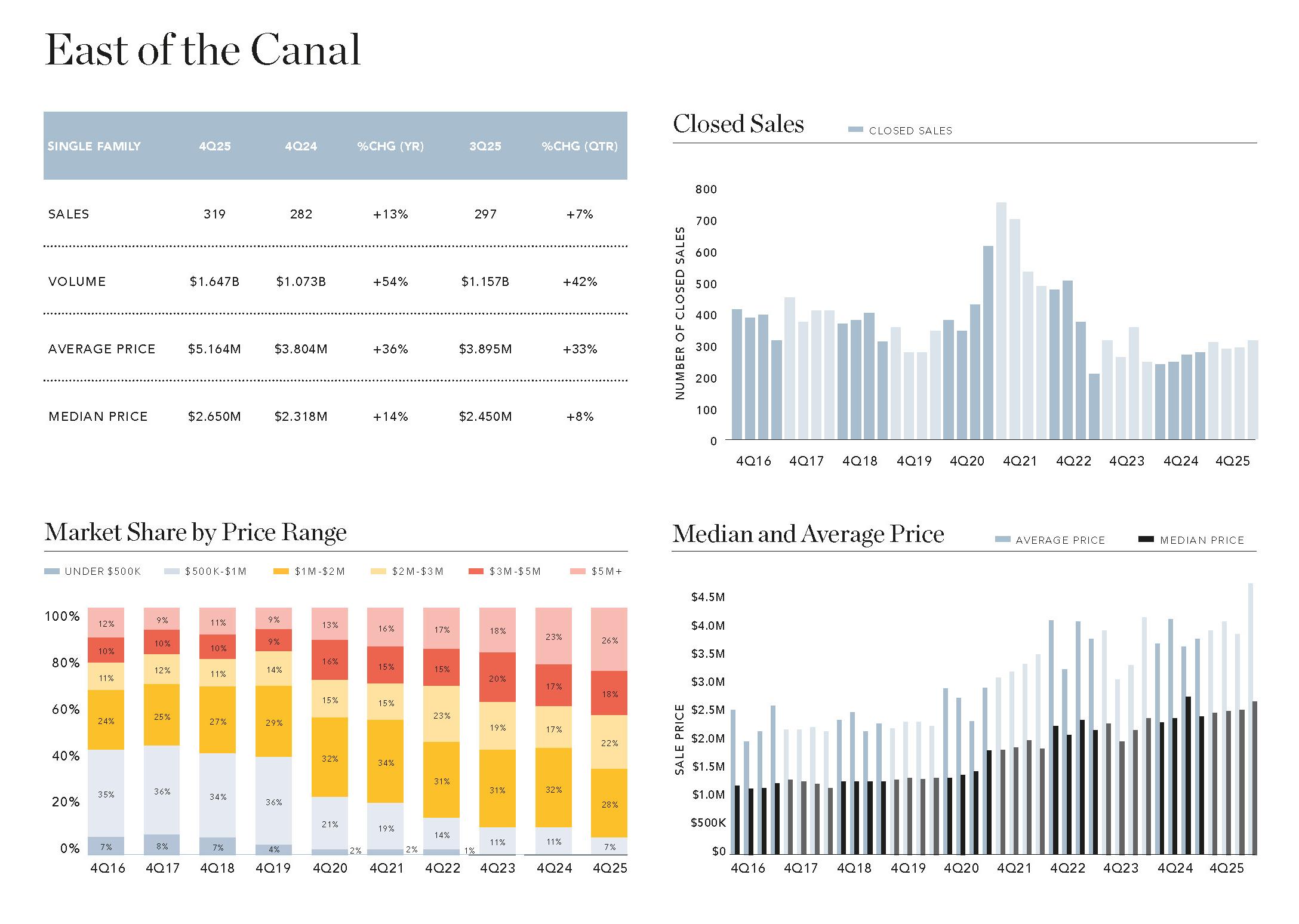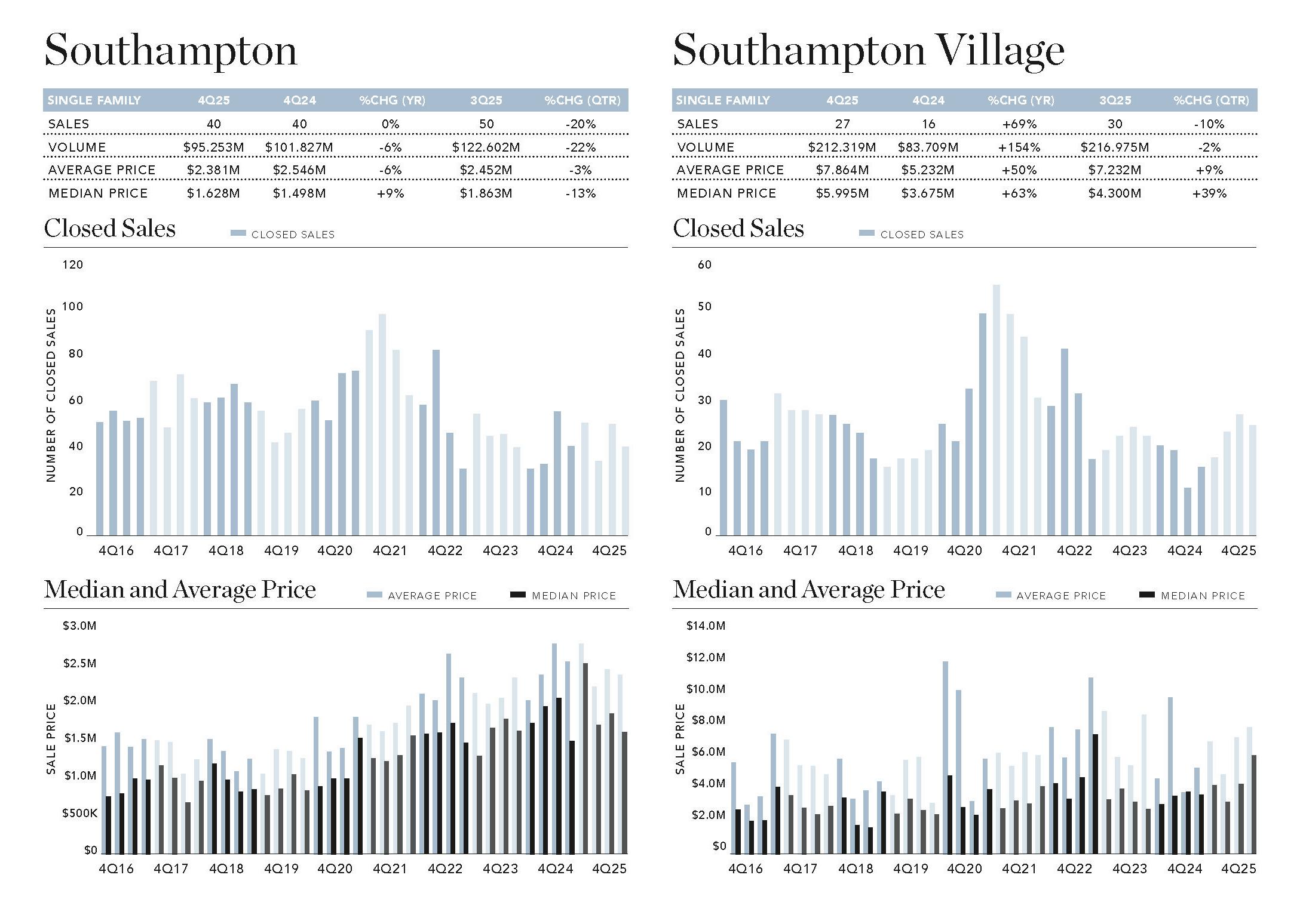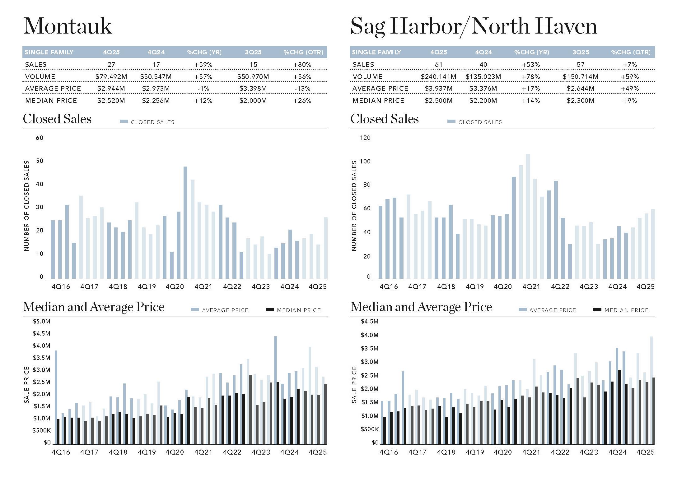 The South Fork reported 434 single-family home sales in Fourth Quarter 2025, the same number of closings reported a year before. This was the fifth consecutive quarter without a year-over-year decline in reported activity, which has not happened since 2021.