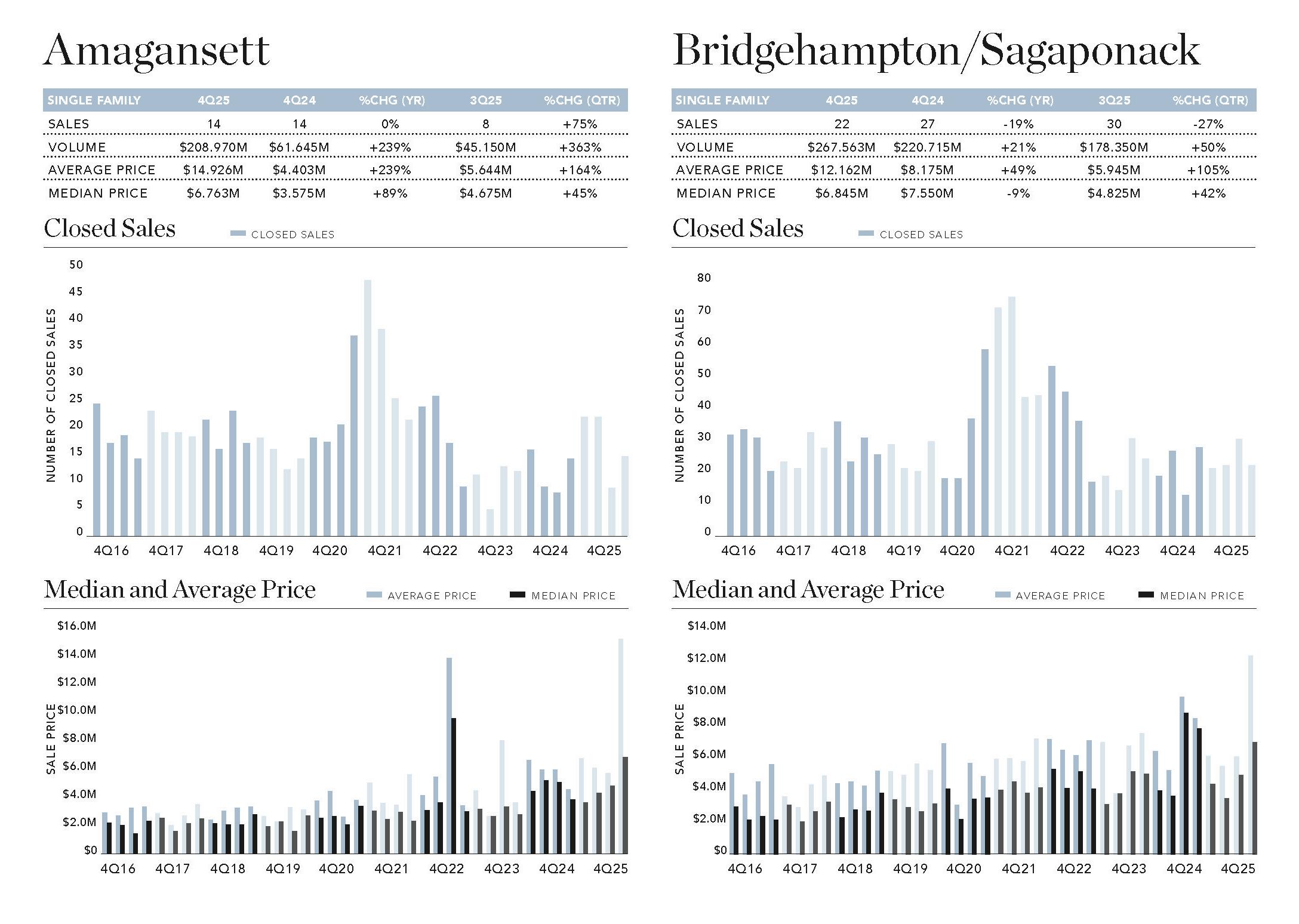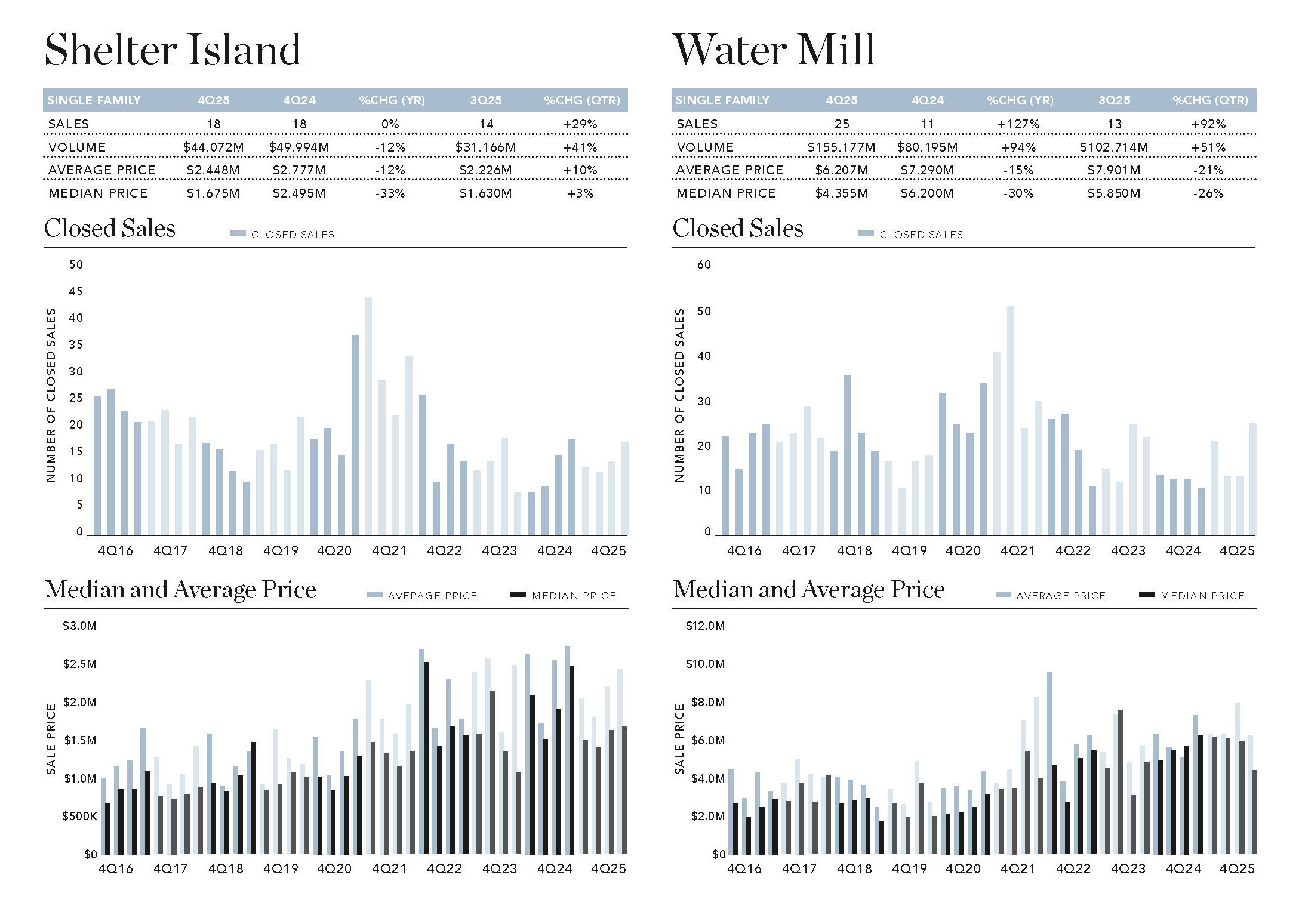 The luxury market is the top 10% of all home sales by price during the quarter. As various factors redefine the high-end market in any given period, price figures may exhibit more volatility than the market overall. However, because the luxury market is a fixed percentage of the overall market, its changes in the number of sales will always match the overall market. In Fourth Quarter 2025, South Fork luxury average price surged 74% to $19.829M. The number of transactions above $20M expanded significantly, rising from just two last year to 11 this year. This increased concentration of ultra high-end sales, combined with a reduced share of transactions below $10M, also pushed the South Fork luxury median price up 23% to $13.46M. A year ago, 16 sales below $10M fell within the top 10% of the market; this year none did. The most expensive sale of Fourth Quarter 2025 was an oceanfront residence on Further Lane in Amagansett, which traded off-market for $115M. Bridgehampton/Sagaponack recorded the highest number of South Fork luxury transactions, with eight closings reported during the quarter. The average luxury sale price for the North Fork fell 22% annually, and median price declined 26% year-over-year. The decreases were a result of a much smaller share of sales over $4M than a year ago. The highest-priced North Fork sale was a 10,000-square-foot shingle-style home with 140 feet of bayfront that sold for $11.2M.
