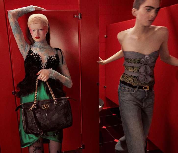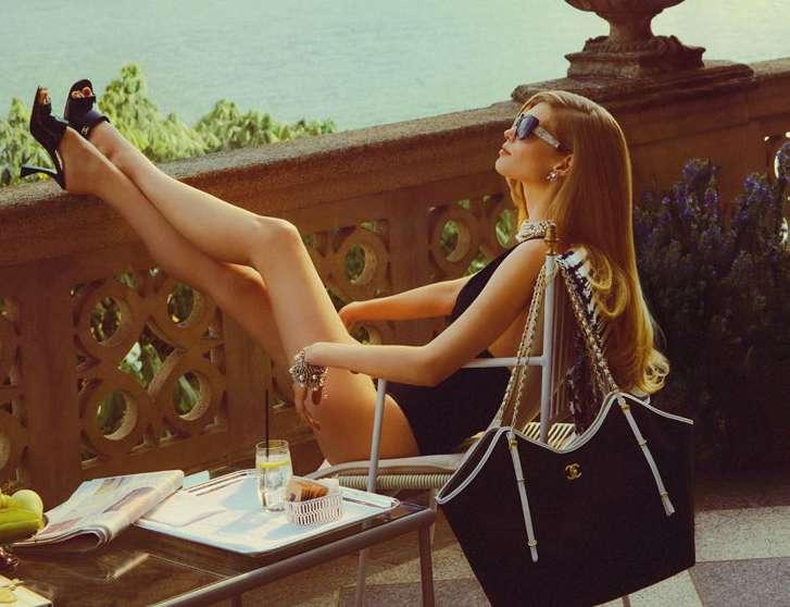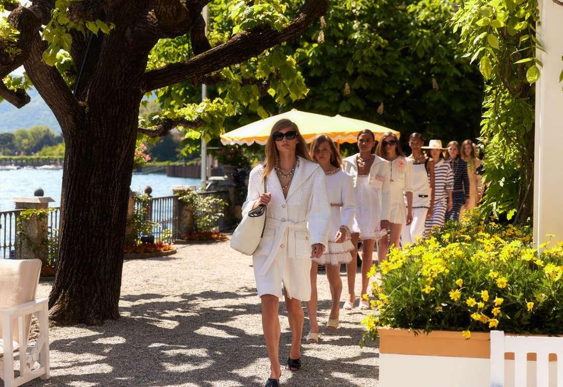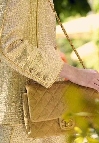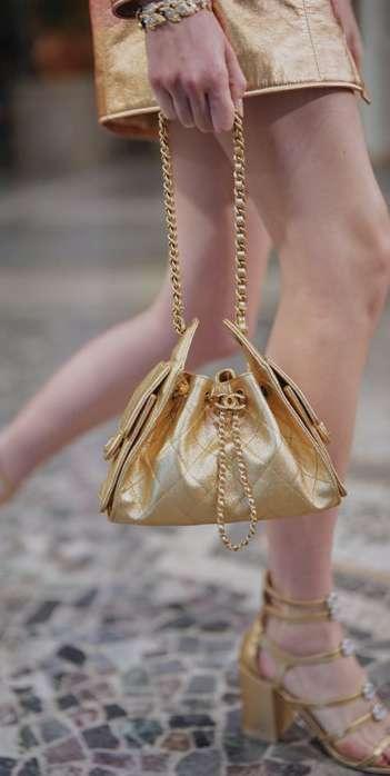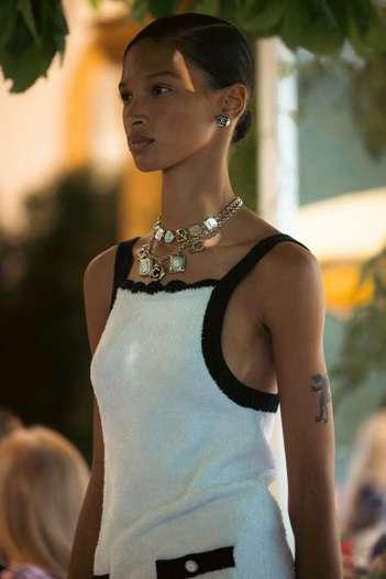 borrowed masculine elements with mixedmetal chains across the vamp. Jewellery embraced a “more is more” philosophy: pearls, glass flowers, and seed beads wrapped around twisted chains, while shells were cleverly woven into jackets and pins adorned garments and straps like keepsakes.