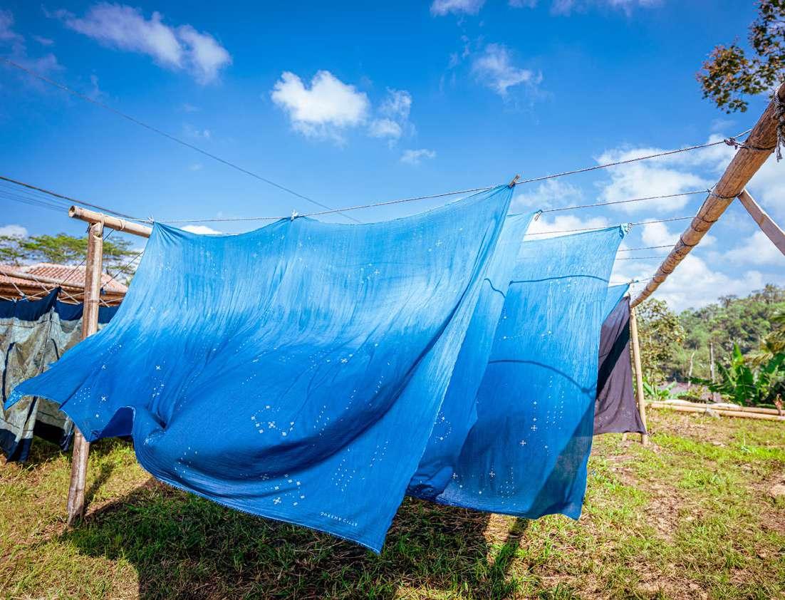 5. Ipeh Nur, “The Waves Haven’t Slept” (2024). Rock powder, charcoal, indigo paste, turmeric, egg shells on canvas and threads, carpet. Single channel video 250 x 400 x 250, video duration 11 minutes 28 seconds