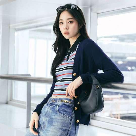 Earn Muien Na competed in the Thai reality show “The Star Idol” and has since starred in TV shows and films, with her most recent one being “Flat Girls” (2025). She showcases effortless airport style in a CELINE cropped polo in striped cotton, Triomphe cardigan, and Dylan flared jeans, as well as the CELINE Triomphe Metal Sunglasses and Teen CELINE Lulu bag.