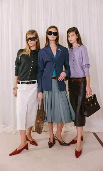 Burch revisited the icons of American sportswear—polos, trenches, and striped shirts—but reimagined them with a crisp, almost architectural precision. Drop-waist dresses paid homage to the 1920s, while hip-slung trousers and leather skirts shifted tailoring proportions lower for a relaxed, almost louche appeal. A standout piece, a piped blazer inspired by Burch’s father Buddy, was both personal and emblematic of the collection’s nostalgic undercurrent. Jackets were cleverly engineered with invisible zippers, allowing the wearer to transform her silhouette—a subtle but ingenious detail that speaks to Burch’s commitment to versatility.