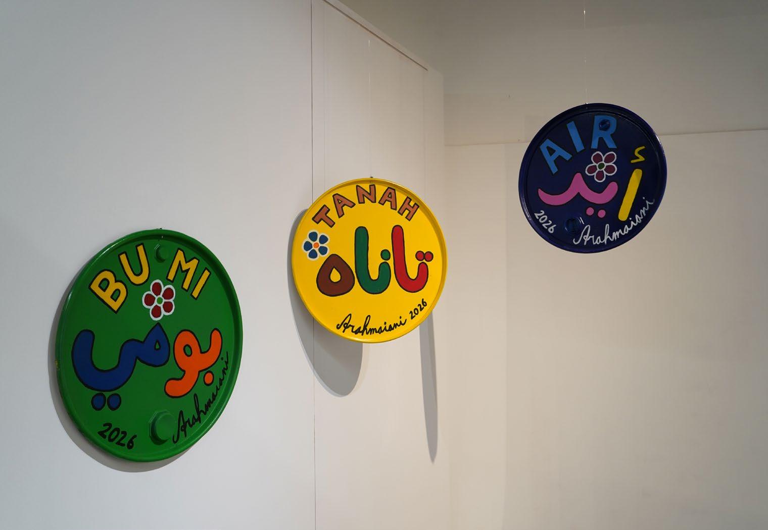 Arahmaiani’s works, “Air, Bumi, and Tanah,” are painted on recycled drum lids. Bright, direct, and multilingual, the words float across industrial surfaces once tied to global production. By reusing these materials, she connects language, faith, and ecology, arguing that cultural coexistence and environmental care are inseparable.