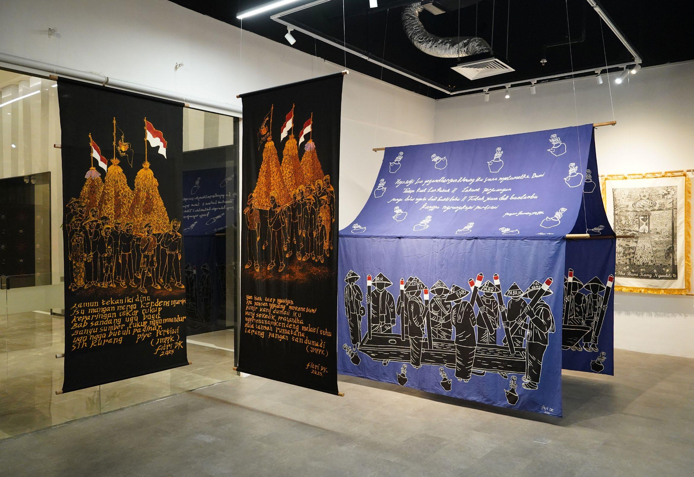 1. Dedicated to environmental resistance, “Biophilia: Exquisite Corpse” asks the audience to take an active part in caring for the Earth. Shown here is Fitri DK’s “Selamatan Bumi #2,” 2025, Batik 200 cm x 125 cm and “Tenda Perjuangan,” 2021, Batik 233 cm x 210 cm x 263 cm