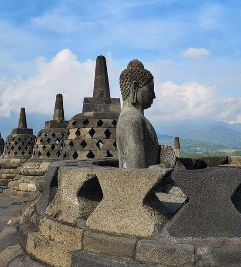 temple helped us shed the rush of travel and ease into a gentler tempo. At lunch, we ate at Tiga Dari Restaurant, where Indonesian dishes felt comforting and true to the region. Later, we wandered deeper into the grounds and discovered the private retreat known as Founder’s Home, the private residence of Yozua Makes, the founder of Plataran Indonesia. The space felt distinctly his, with old teak, curated art, rare books, and a livedin vintage charm. With its private pool, roomy living areas, and direct views of Borobudur, the villa felt both secluded and welcoming.