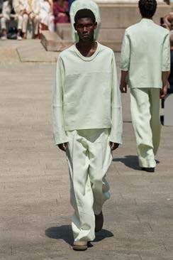 categories. Deconstructed jackets, airy duster coats, and versatile round-neck tops redefine traditional styles. Vests transform into tank tops, and bombers seamlessly flow into shirts. Sack jackets with 3⁄4 length sleeves make a return from the previous season. Trousers take on a fuller silhouette, complemented by pragmatic shorts and jumpsuits.