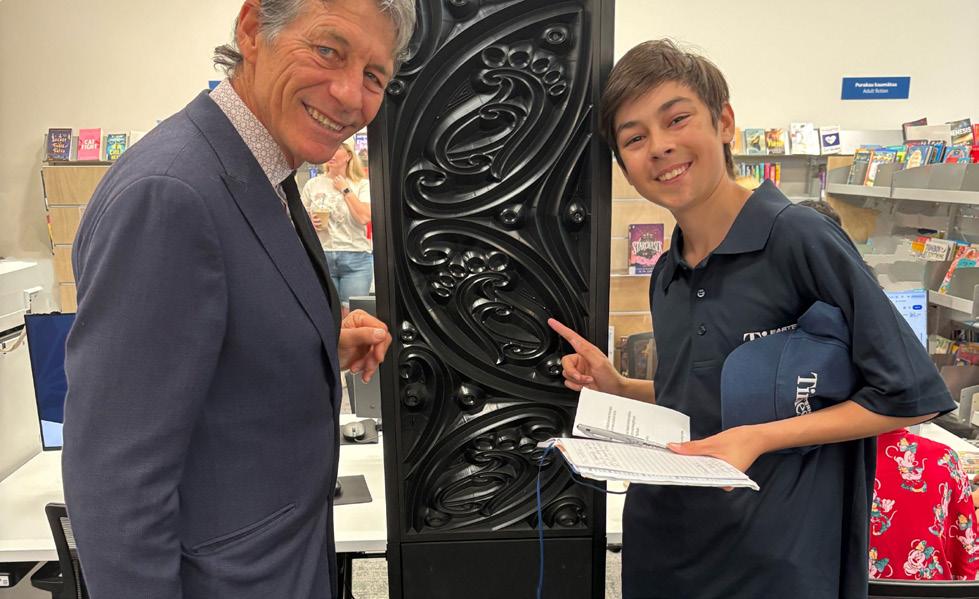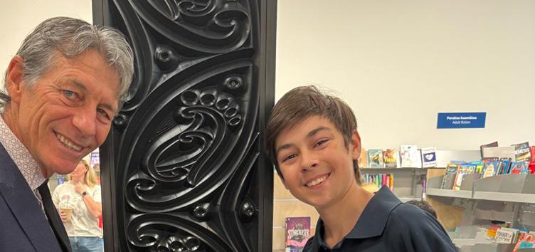 Howick Local Board chairperson Bruce Kendall, left, with Junior Journalist Josh Arnold beside the Ngāi Tai ki Tāmaki carving pattern on the column inside the new Flat Bush Library. Photo supplied