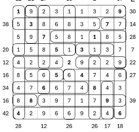 • The numbers in each rectangle must add up to the total shown on the edge of the grid.