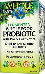 Whole Ear th & Sea Fermented Whole Food Probiotic provides 10 billion active cells of 10 strains of beneficial bacteria per capsule This vegan-friendly, one -per-day synergistic synbiotic formula helps support gastrointestinal health and wellness