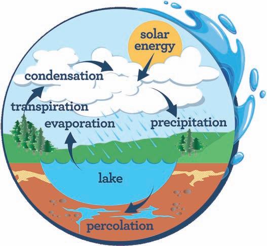 El agua del mundo se mueve entre lagos, ríos, océanos, la atmósfera y la tierra en un ciclo continuo llamado ciclo del agua. El sol sale y comienza a calentar los océanos, lagos y ríos. Este calor proporciona energía a las plantas para que liberen vapor de agua mediante un proceso conocido como transpiración. Ese vapor asciende a la atmósfera para formar nubes, que el viento puede desplazar a grandes distancias. Esto finalmente produce lluvia o nieve. Esa precipitación se infiltra en el suelo o se escurre por la tierra para regresar al océano.