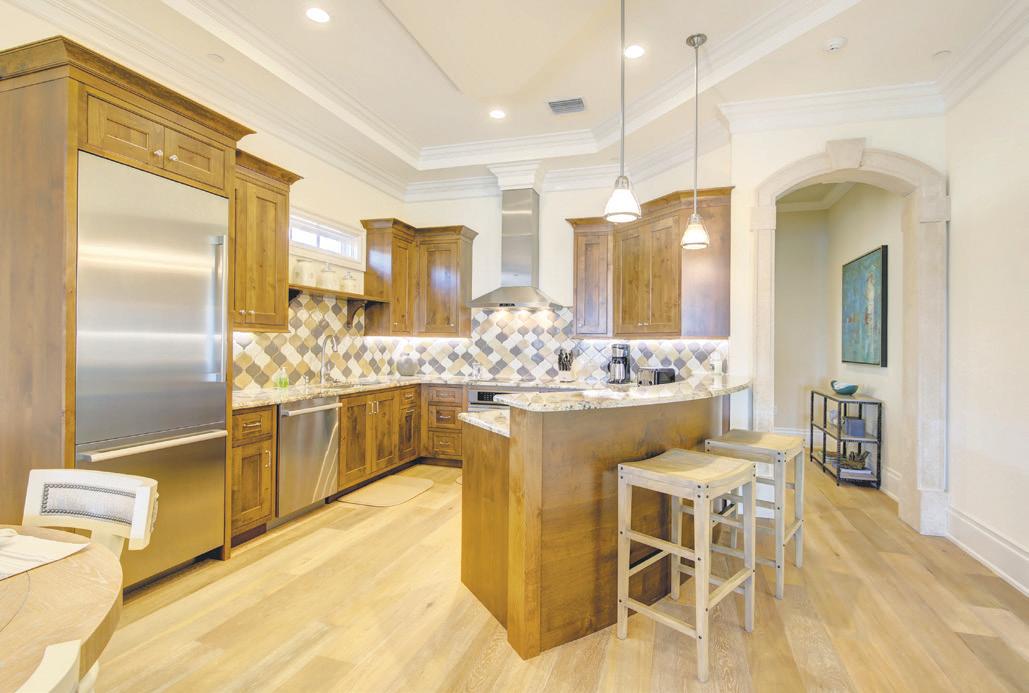 If the weather turns, you won’t be bored. Inside, challenge a friend to a game in the custom-designed twolane bowling alley (adjacent to the grilling area) or hit the posh rec room with custom pool table, Pac Man, foosball and air hockey. (The unique pool table-in-a-car was designed by the home’s current owner Ben Mallah, co-founder of CarPoolTables in Safety Harbor.) A temperature-controlled wine storage room and bar area (complete with ice maker, wine fridge, and kegerator) elevates your