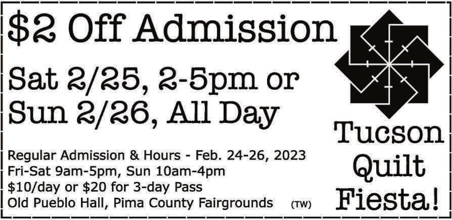Tucson Weekly® is published every Thursday by Times Media Group at 7225 N. Mona Lisa Rd., Ste. 125, Tucson, Arizona. Address all editorial, business and production correspondence to: TucsonWeekly, 7225 N. Mona Lisa Rd., Ste. 125, Tucson, Arizona 85741. Phone: (520) 797-4384, FAX (520) 575-8891. Member of the Association of Alternative Newsmedia (AAN). The Tucson Weekly® and Best of Tucson® are registered trademarks of Times Media Group. Publisher has the right to refuse any advertisement at his or her discretion. Copyright: The entire contents of Tucson Weekly are Copyright Times Media Group. No portion may be reproduced in whole or part by any means without the express written permission of the Publisher, Tucson Weekly, 7225 N. Mona Lisa Rd., Ste. 125, Tucson, AZ 85741. To start or stop delivery of the paper, please visit: https://timespublications.com/tucson/ or call 480-898-7901 To receive your free online edition subscription, please visit: https://www.tucsonlocalmedia.com/newsletter/signup/ Tucson Weekly is distributed by AZ Integrated Media a circulation company owned & operated by Times Media Group The public is limited to one copy per reader. For circulation services, please contact Aaron Kolodny at aaron@phoenix.org. 18 Tucson’s best restaurants to satisfy the munchies WEEDLY Ben Palmer is trolling his way to the top LAUGHING STOCK 12 Rodeo brings professional cowboys, cowgirls to Tucson CURRENTS 6 CONTENTS Cover photo from The Linda McCartney Retrospective, the first U.S. retrospective of the late photographer’s work. (Center for Creative Photography/Submitted ) presents Quilt Fiesta! 2023 Infoat TucsonQuiltersGuild.com PimaCountyFairgrounds OldPuebloHall 11300S.HoughtonRd. Tucson,AZ February24-26 Friday&Saturday 9am-5pm Sunday 10am-4pm $10perdayor $20per3-daypass $5Parking “LionandthePaintbrush”byValerieGreenwell Visit us at booth 445 at the Tucson Festival of Books Saturday March 4 and Sunday March 5, 2023 ? 6 4 5 STREET CLOSURE 3 QUAD-8 VERSION 11 2-1-2023 2023 MAP 11.0 TFOB MAPS Dr. Dave Cornelius presentation and signing
