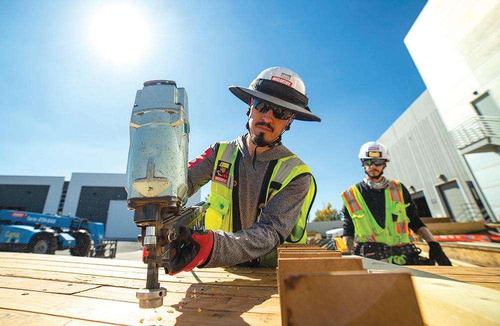 Oscar Lozano uses a nail gun to show Ronnie Minyard how to fasten down a prefabricated building piece at the McCarthy Building Companies’ new Innovation and Craft Workforce Center in Chandler. It’s an effort to attract people to the construction trades, as you’ll read on page 18