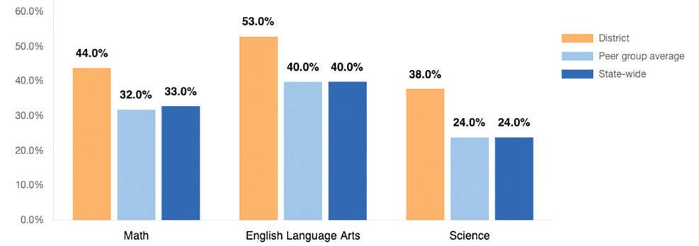 (Left) Kyrene spent 71.9% of its budget last year in the classroom. (Below) Kyrene students outperformed on assessment tests for math, science and English Language Arts with higher passing percentages than the state average and that of similarly sized school districts in the state.
