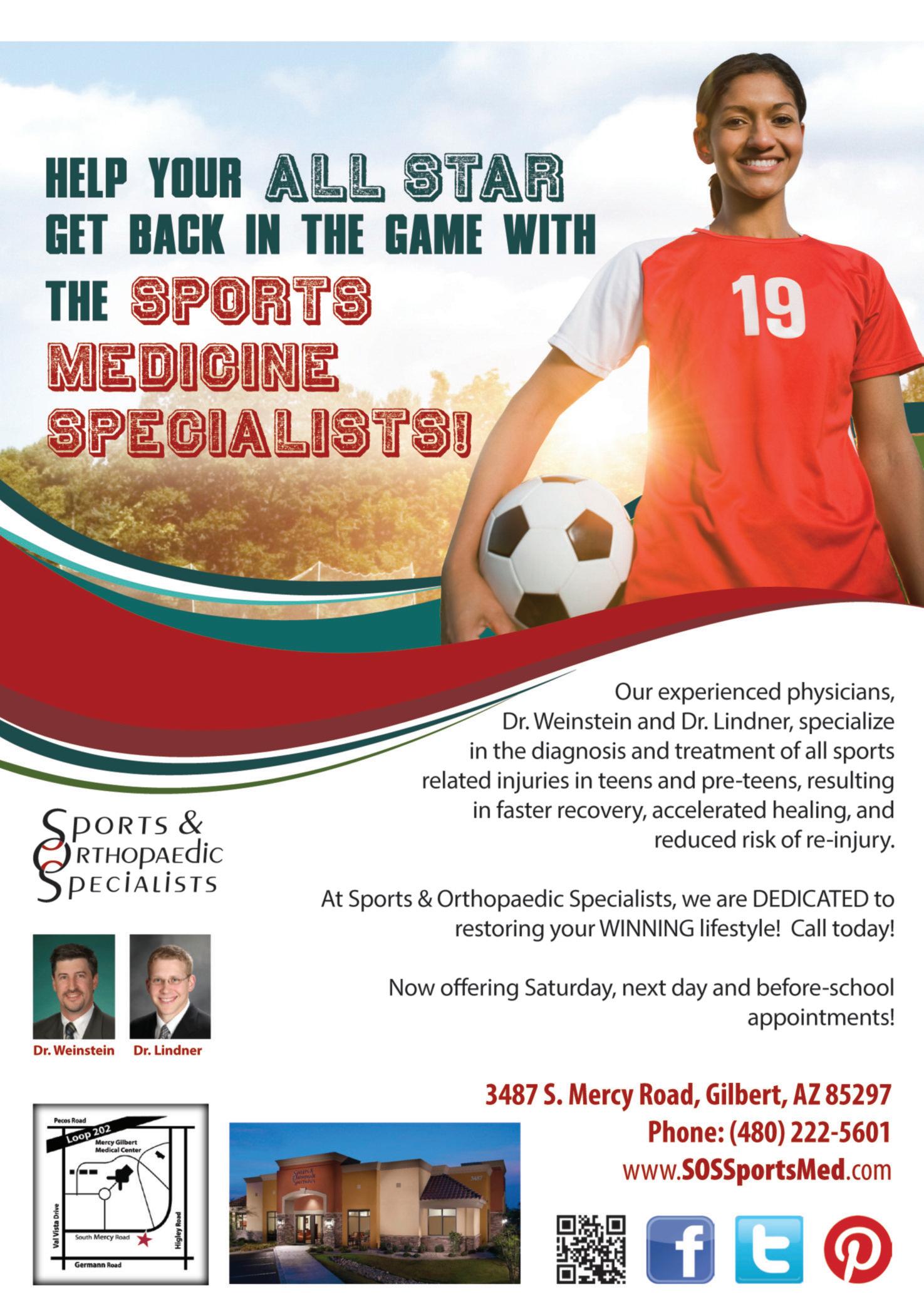Sports & Orthopaedic Specialists, Drs. James Lindner and Craig Weinstein, offer a free Q & A Seminar for parents of teen athletes at Sports and Orthopaedic Specialists, 3487 S. Mercy Rd., Chandler, to provide parents of teen athletes information on identification, prevention and healing of common injuries. This will include concussions, strains and sprains and identification of other injuries which may not be present until after the game