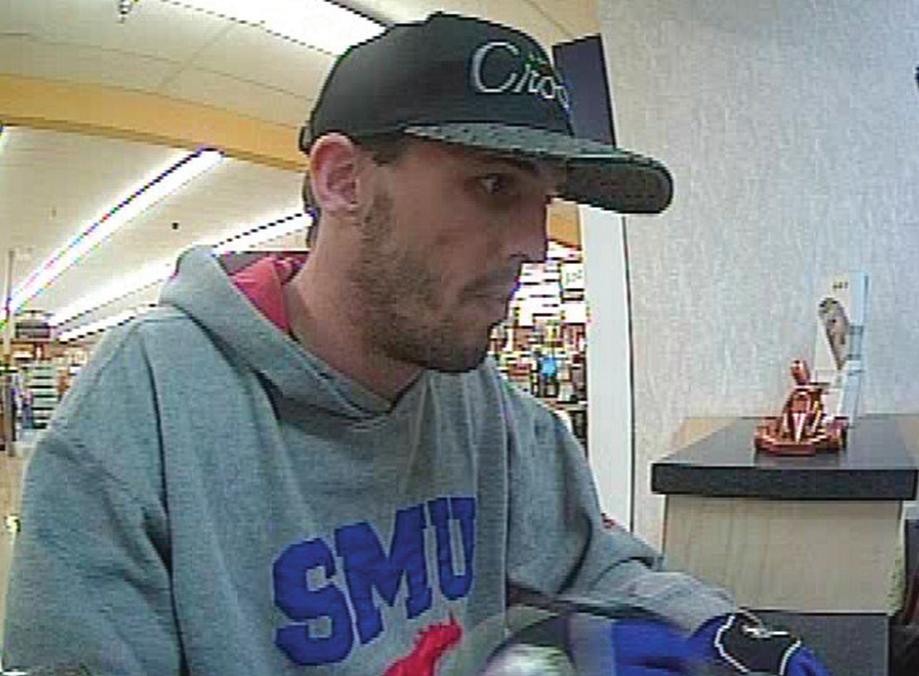 The suspect was recorded at about 2:45 p.m., Jan. 4 and fled the store westbound on foot with an undisclosed amount of currency. The man is described as a white male, approximately 25 years of age, 5-feet 11-inches tall, 160 pounds, with a dark beard and hair. He was wearing a black baseball hat and a gray hooded sweatshirt with the letters “SMU” on the front.