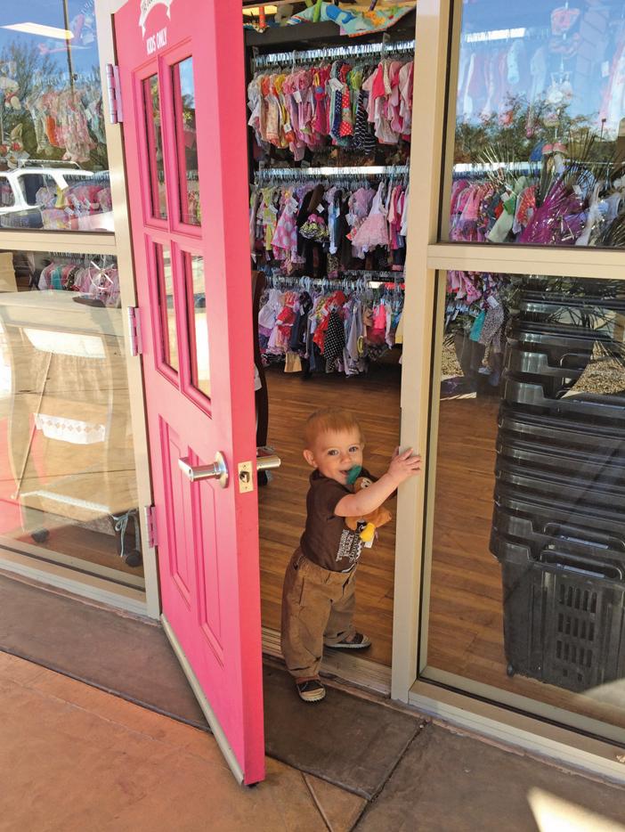 Gentile’s son, Cooper, peeks out of the pink kids’ door which is adjacent to the regular door at Kid to Kid.