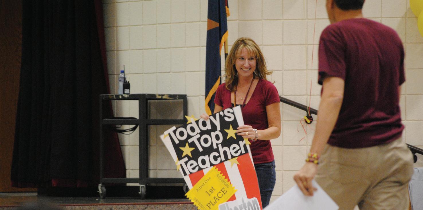 POPPING TO THE TOP: Carlson kindergarten teacher Christine Thornton proudly shows off her class’ popcorn award at the school assembly. Her class raised the most money in the PTO’s Checka-thon fundraiser and will receive a popcorn party after fall break, along with Mrs. Montano’s first graders, who came in second place. The fundraiser, which earned more than $16,000, will buy additional cafeteria tables, outdoor benches, a popcorn machine for special events and supplemental academic support materials and resources for classrooms. Submitted photo
