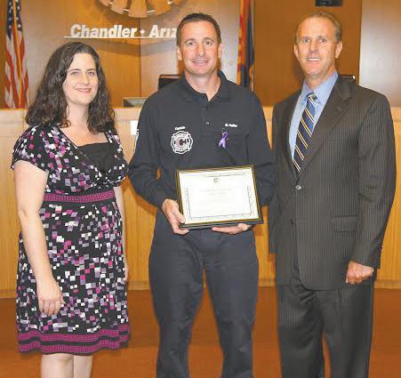 FIREFIGHTER HONORED: Capt. Mike Pallas, center, receives the Chandler Fire, Health and Medical Department’s Employee of the Year Award from Mayor Jay Tibshraeny, right, and Councilwoman Trinity Donovan during a recent City Council meeting. Photo courtesy of CFHMD