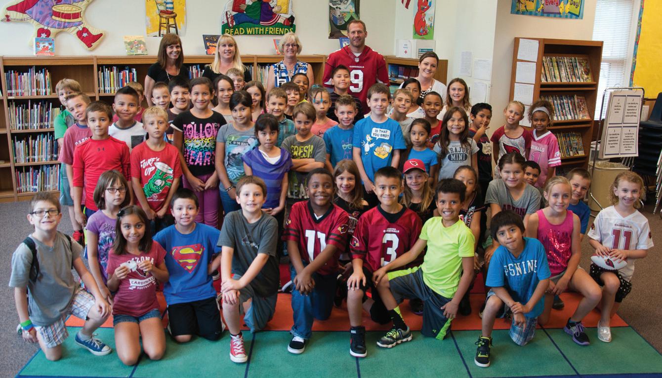 VISITOR: After receiving word that Hancock Elementary School would be receiving a visit from an Arizona Cardinals player through their “Milk & Cookies” program, 50 lucky third-grade students had their names drawn to meet Dave Zastudil. The punter, along with mascot Big Red, joined the third graders in the media center on Tuesday, Sept. 16. Students had fun dancing with Big Red, listening to Zastudil read them stories and munching on milk and cookies. It was an exciting way to celebrate literacy with a hometown hero. Submitted photo