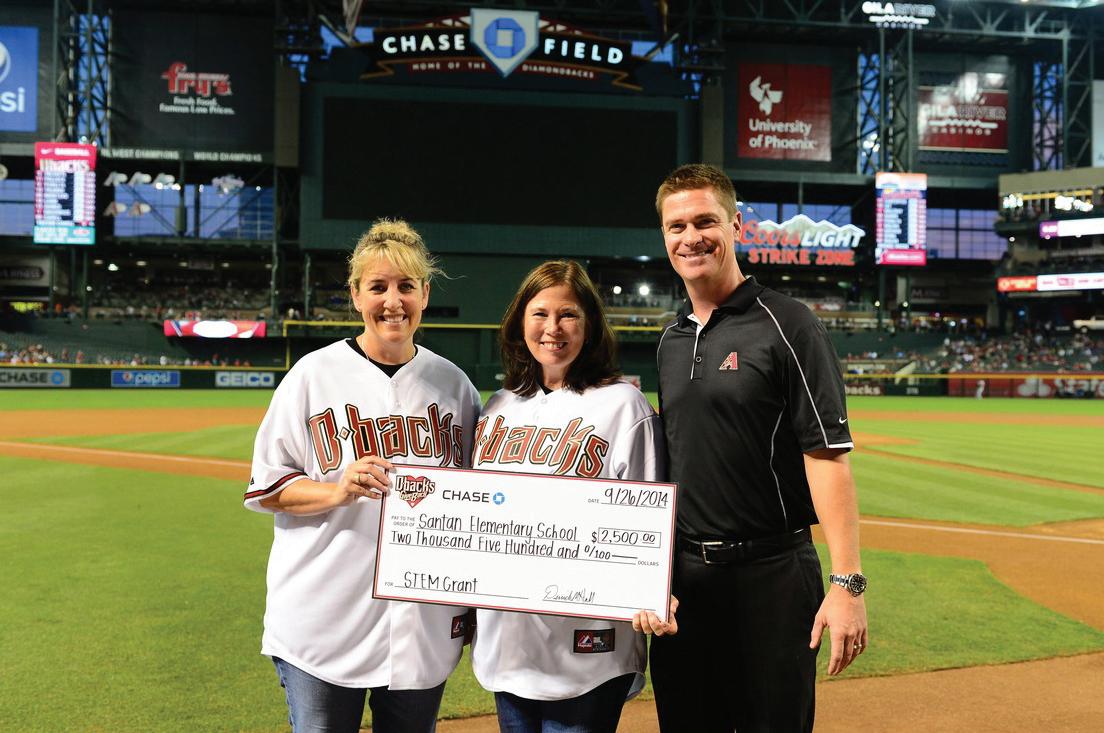 Santan Elementary School was among the 10 STEM clubs and teachers who received a $2,500 grant from Chase and the Arizona Diamondbacks Foundation prior to the baseball team’s Friday, Sept. 26, game against the St. Louis Cardinals. Santan Elementary School will use the funds for its LEGO Robotics Acceleration and Challenge Period. On hand to receive the donation were fifth-grade teachers Wendy Banas and Kierstin Yamashita.
