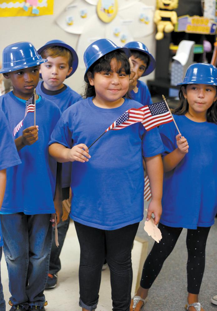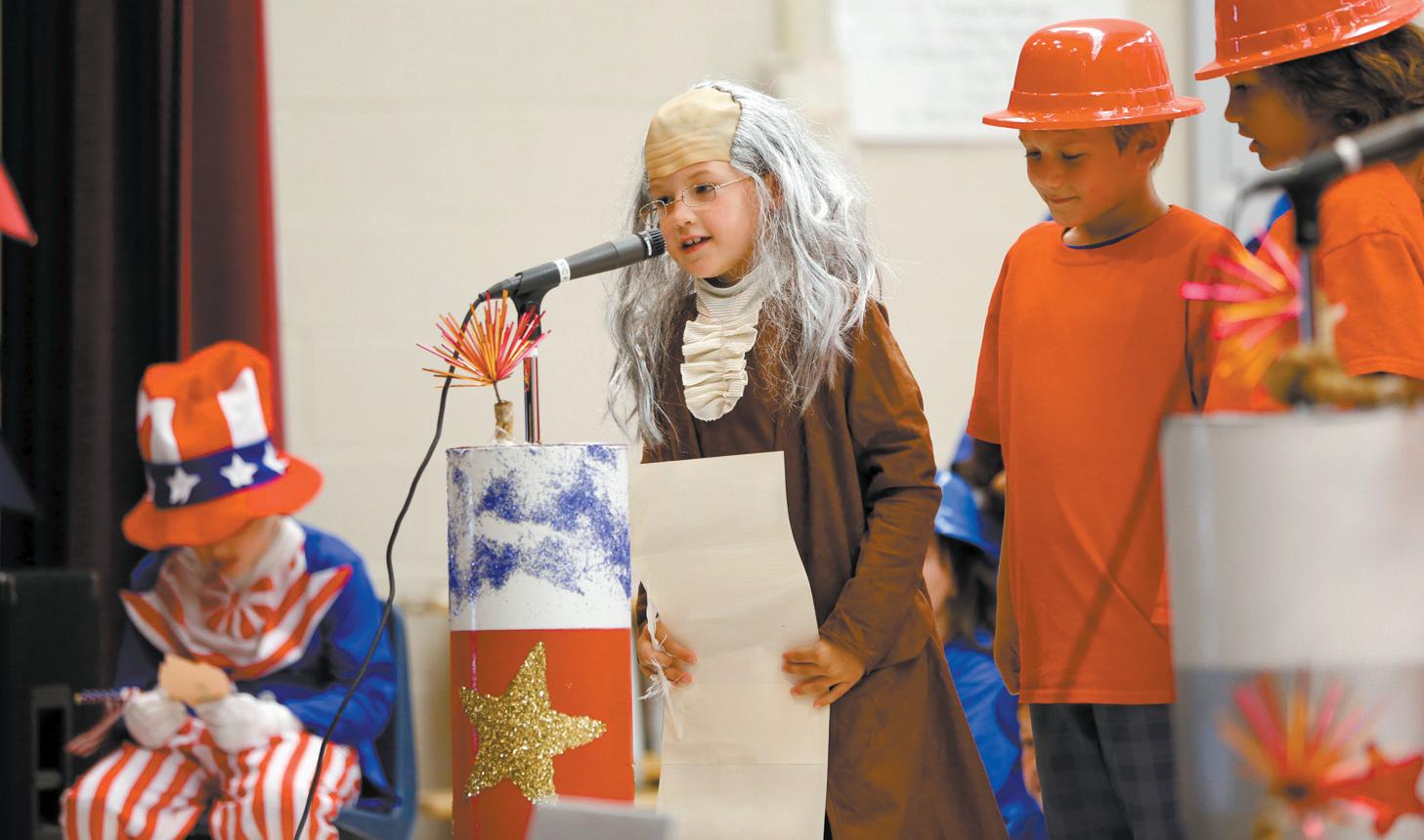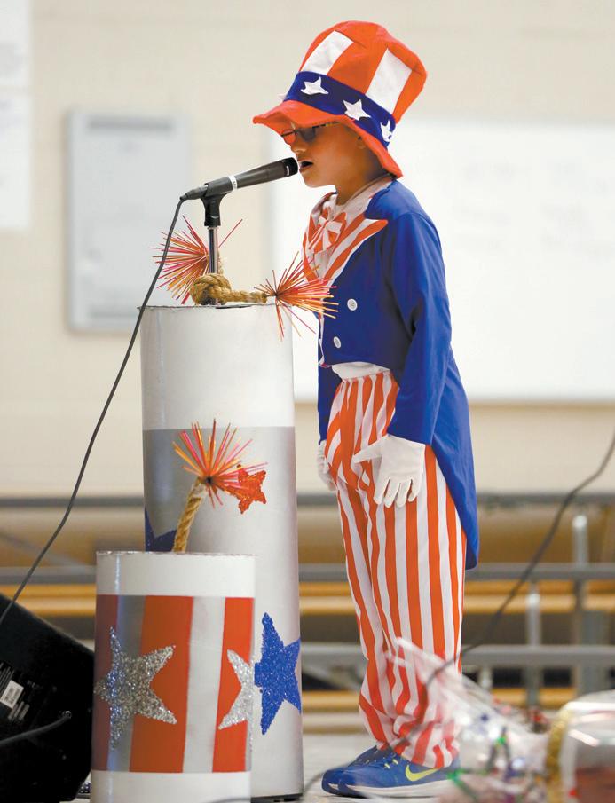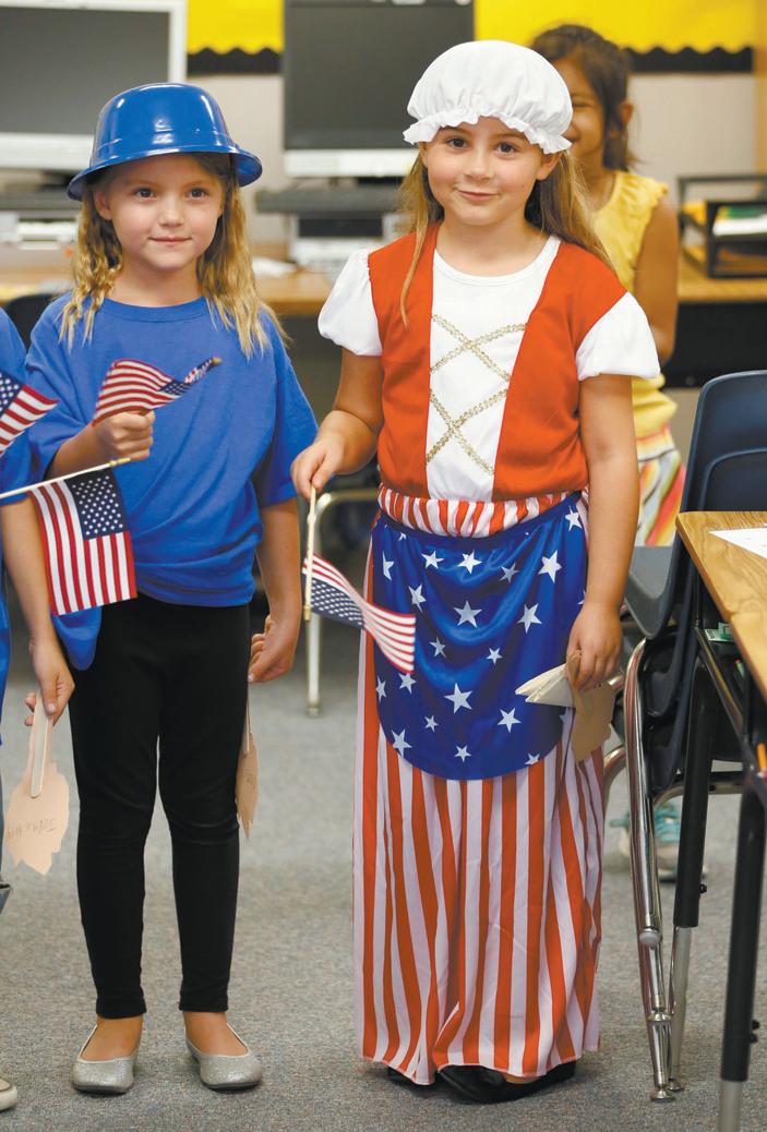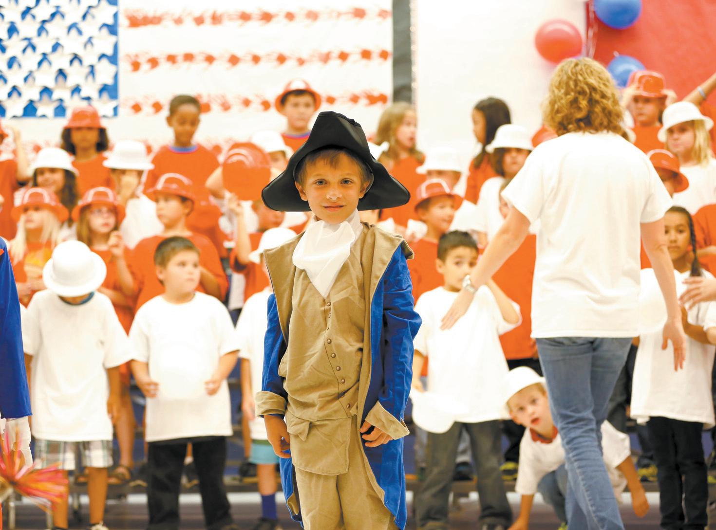 The Tarwater Family Room was filled to capacity with students and staff as more than 125 enthusiastic second-graders paid tribute to the men and women who died in the terrorist attacks on Sept. 11, 2001. The kids proudly marched in, singing the patriotic songs like “Yankee Doodle” and “Grand Old Flag.” Students dressed as a plethora of historical personalities such as Uncle Sam, Betsy Ross, Francis Bellamy, Benjamin Franklin, Emma Lazarus and George Washington. The Sept. 11 program was created by Principal Jeff Hensley along with Stacy Quattrochi, of the second-grade team, and Mary Chappell, music teacher. The program is part of Tarwater’s social studies standards, and the national symbols are covered in social studies. Photos by Tim Sealy