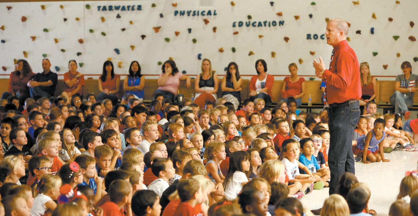 FREEDOM: Tarwater Elementary principal Jeff Hensley talks to the student body about the importance of the freedom and independence we all share here in the USA.