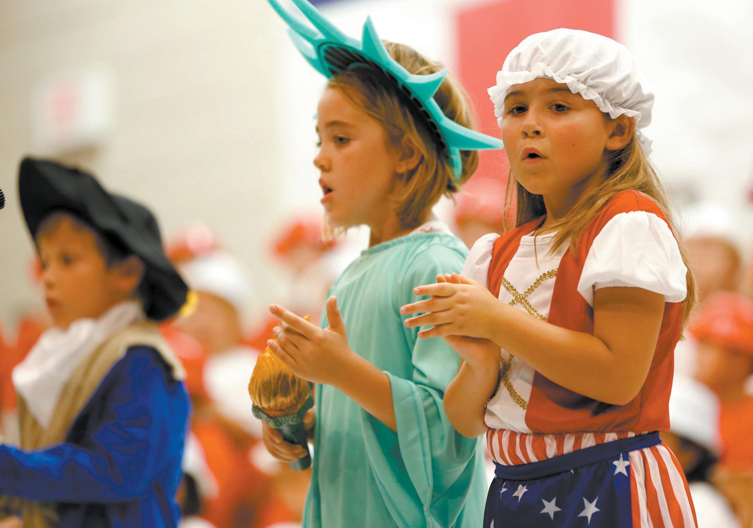 PATRIOTIC FIGURES: Madelyn Ortiz as Betsy Ross and Ava Titcomb, who plays Lady Liberty, sing songs about freedom.