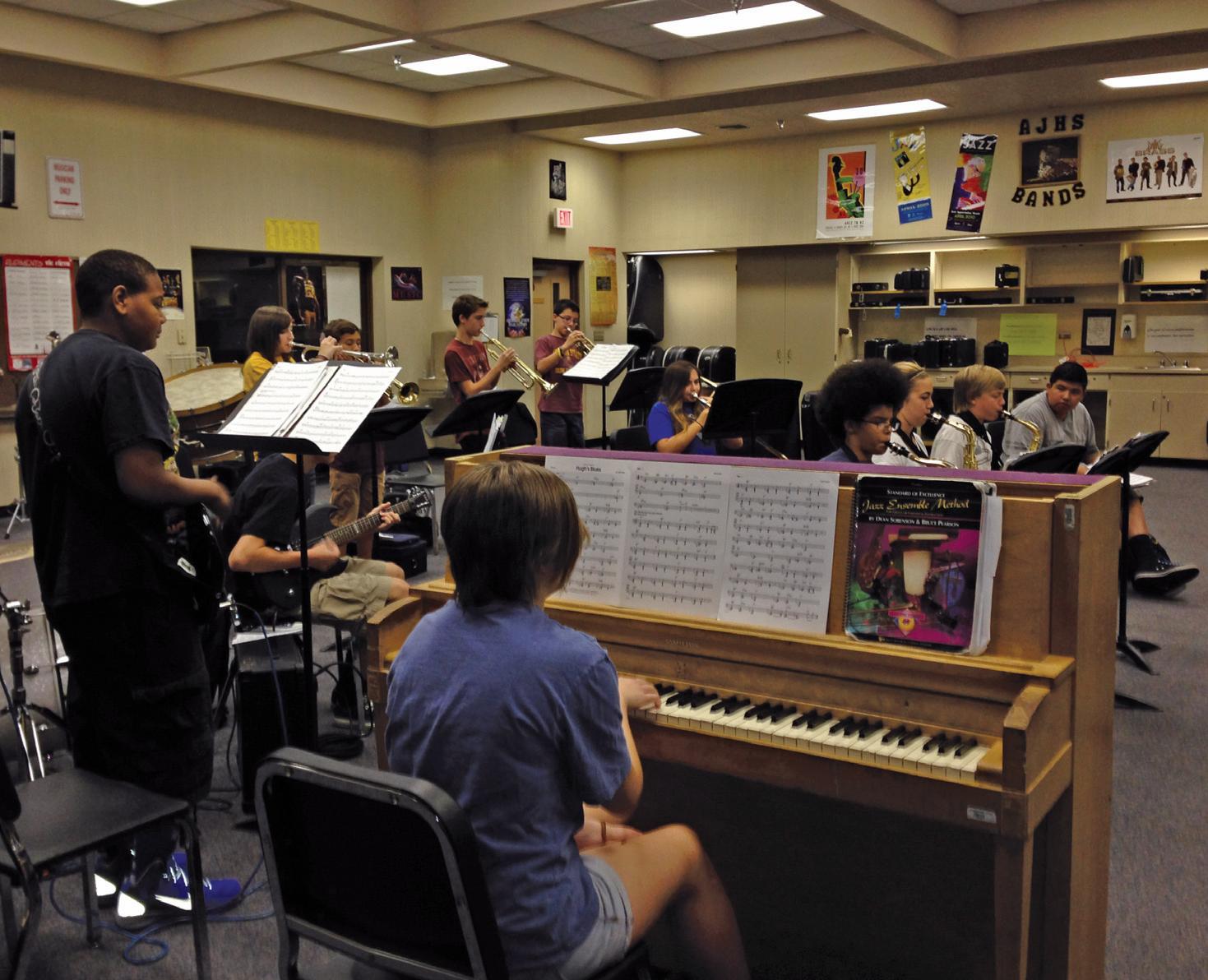 The jazz band, which is directed by Scott Lewis, consists of approximately 20 students who are mostly eighth graders. The regular choir, which is referred to as the advanced choir, has 20, seventh and eighth grade students. The show choir includes 20 of the best sixth, seventh and eighth grade dancers and singers.