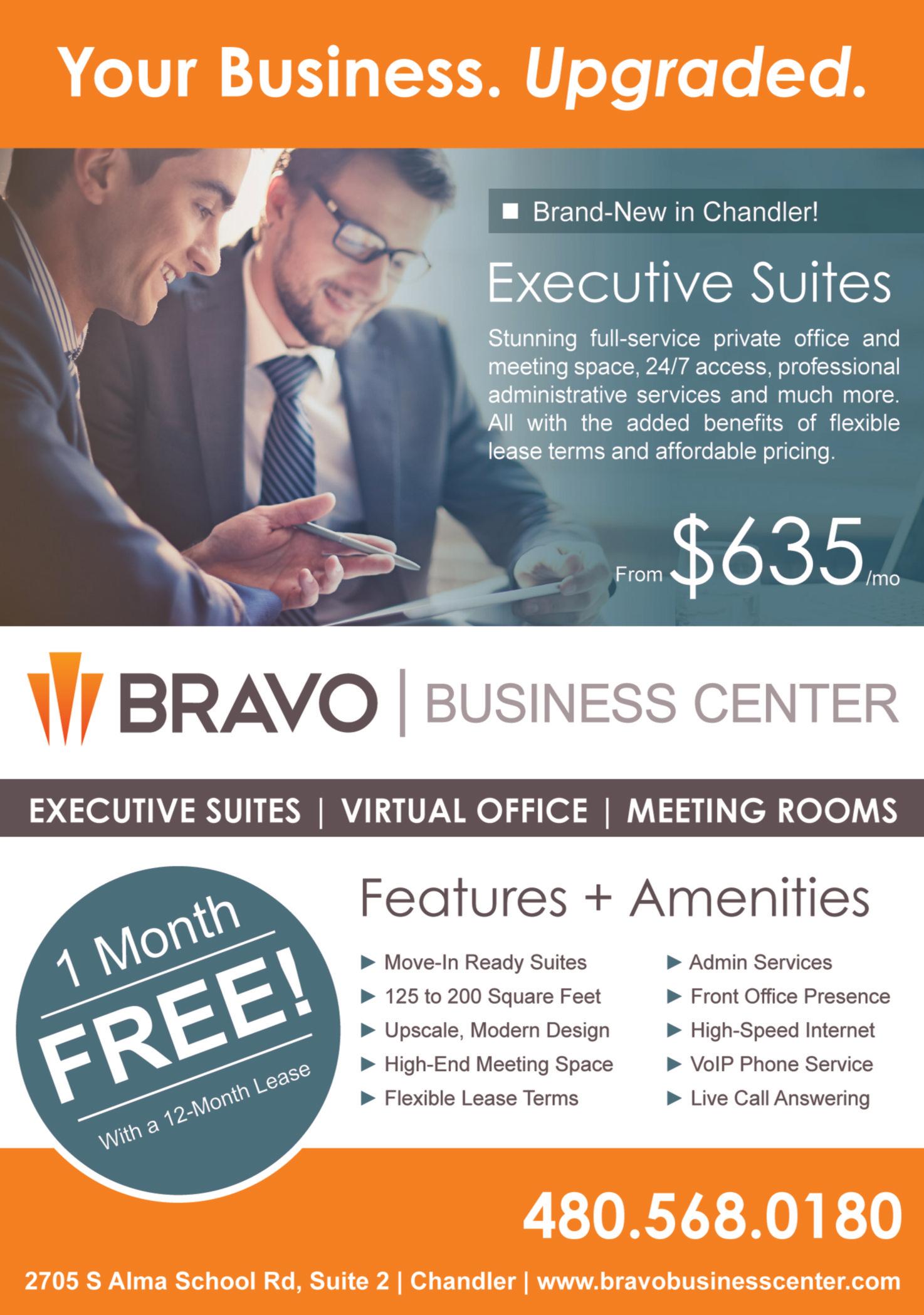 at 2705 S. Alma School Rd., Suite 2, Chandler, in Dobson Town Place Business Park. For more information, call (480) 568-0180 or visit www. bravobusinesscenter.com.
