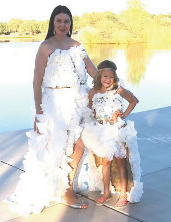 Sophia Phillips designed the winning garment in the adult 18-and-older category, which was modeled by her daughter, Jaelyn, and made with 1,000 coffee filters, coffee burlap bags and magazines.