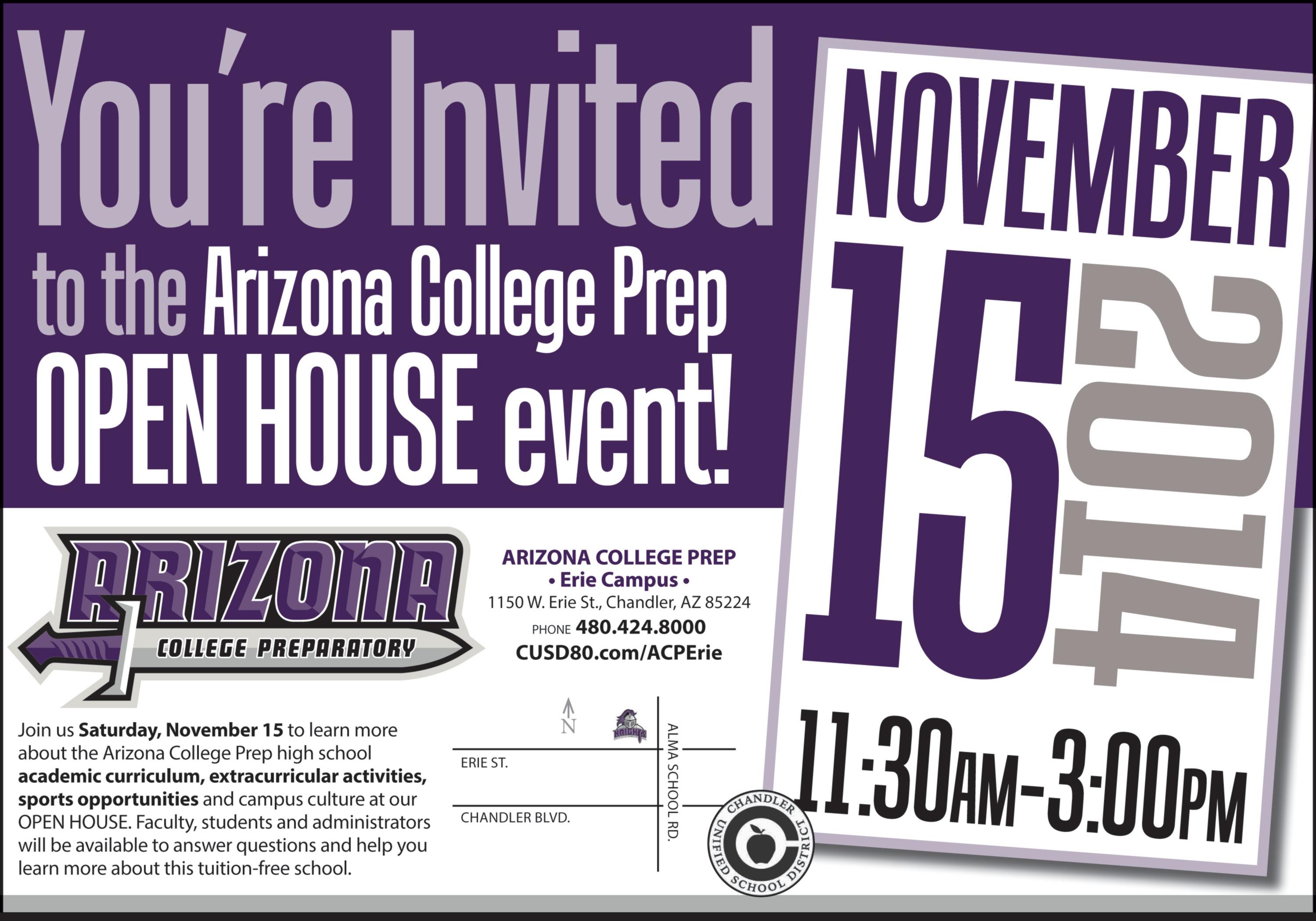 Students and parents interested in learning more about Arizona College Preparatory (ACP) – Erie are invited to take a tour from 11:30 a.m. to 3 p.m. Saturday, Nov. 15, at the school’s campus at 1150 W. Erie St., Chandler.