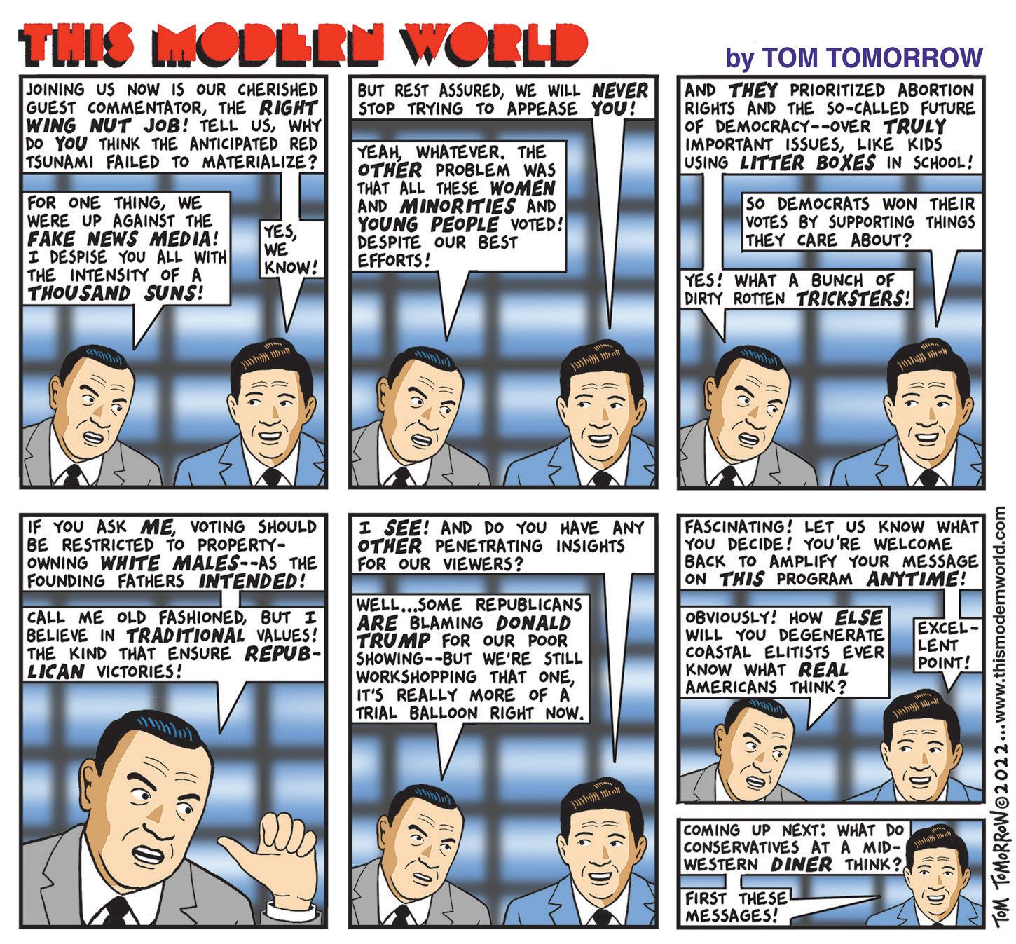 him trying to explain what happened. It was vote by mail. It was an algorithm. It was cured ballots. It was faulty counting machines. It was Jewish space lasers. It was everything but the truth, that being that the majority of Arizona voters were so turned off by Lake’s vulgar regurgita tions of Trump’s lies that they were will ing to vote for milquetoast Katie Hobbs.