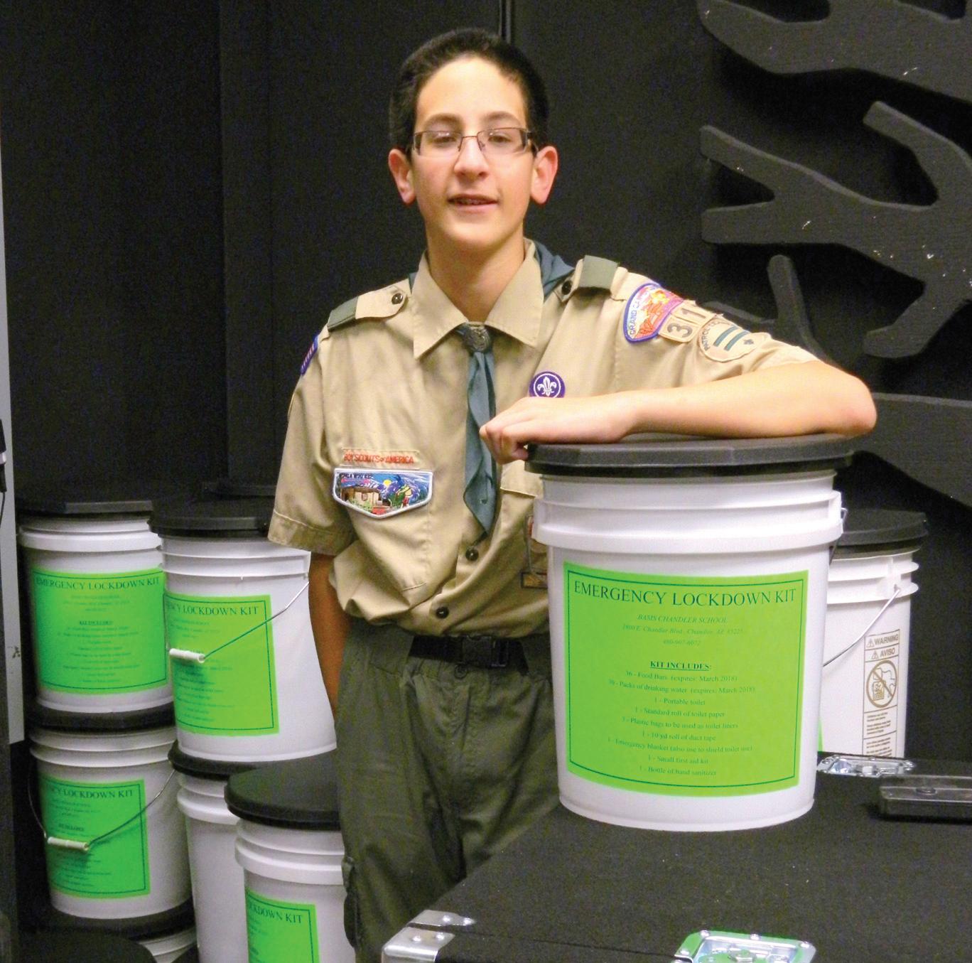 BE PREPARED: Eagle Scout Nikolas Eberlein of Troop 312 developed the idea of classroom lockdown kits for school classrooms to use in an emergency. Each kit contains a 5-gallon plastic bucket, a snap-on toilet seat lid, a roll of toilet paper, three plastic kitchen garbage bags, a first-aid kit, an emergency blanket, antibacterial gel, a roll of duct tape, survival food bars and purified emergency water. The kits were given to BASIS Chandler as part of his Eagle Scout project. Submitted photo