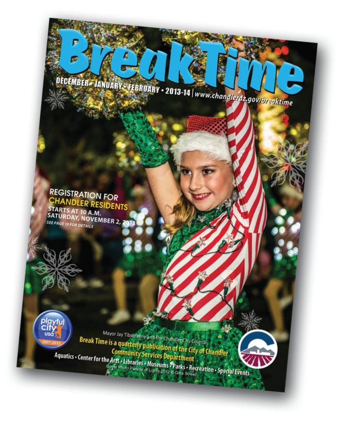 The winter Break Time magazine outlining all-ages recreation classes, youth camps and special events for December, January and February is available at libraries and city offices as well as aquatic and recreation centers and online at www.chandleraz.gov/breaktime. For more information, call 480-782-2727.