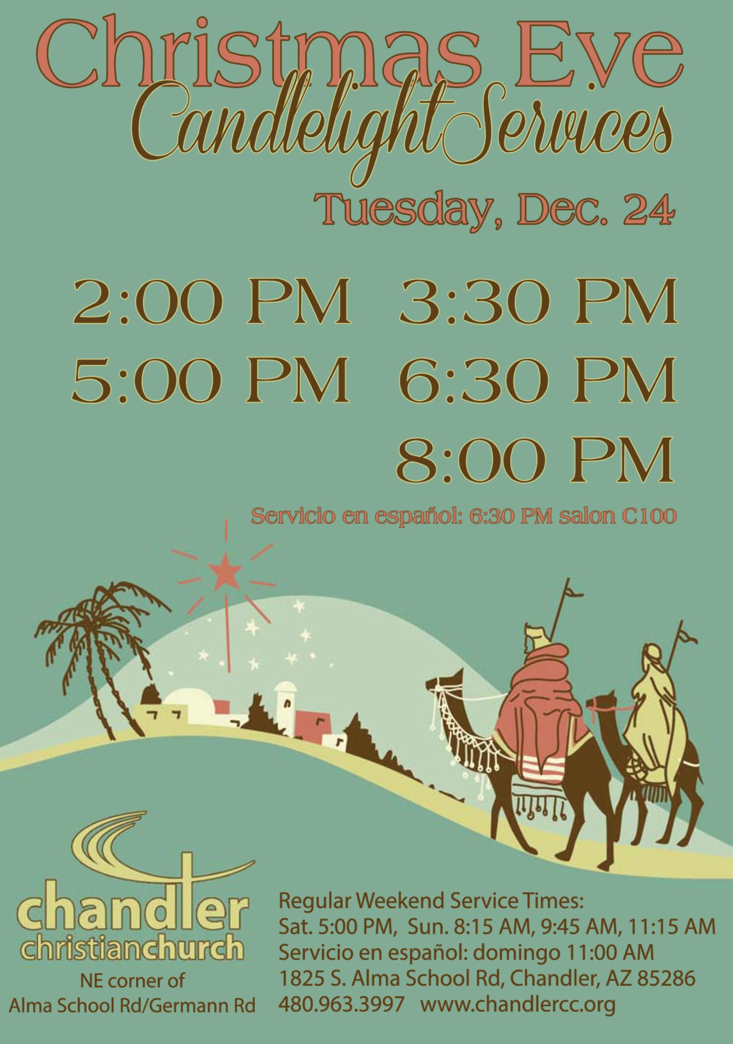 The church will host Christmas Eve Candlelight Services at 2, 3:30, 5, 6:30 and 8 p.m. Tue., Dec. 24.