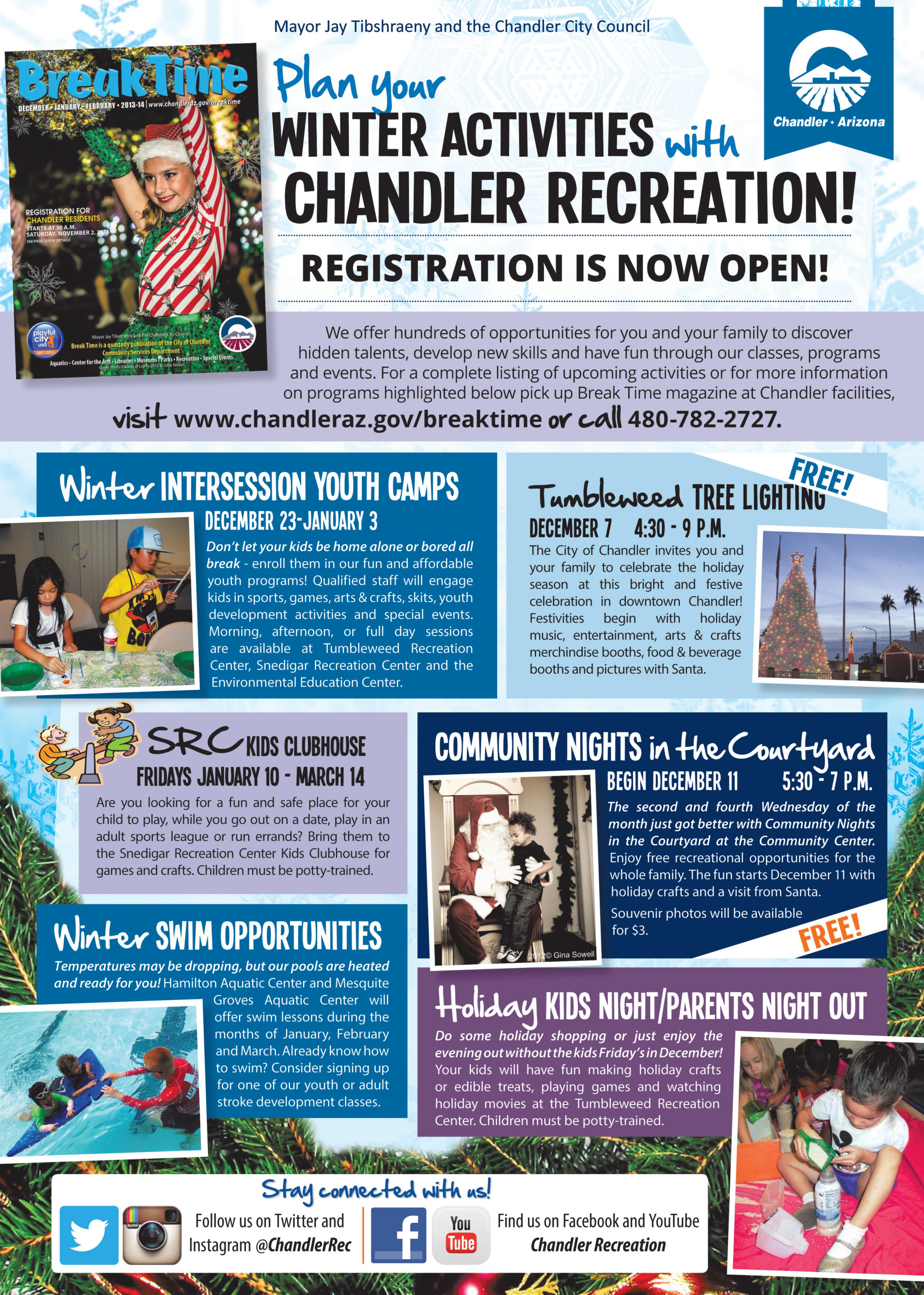 Tumbleweed Tree Lighting Ceremony & Parade of Lights, 4:30-9 p.m. Watch the mayor and members of the City Council flip the switch to light this magnificent sight. The community festival also includes traveling performers and Santa’s House. Free pictures with Santa. Watch floats, vehicles and community groups light up the streets of Chandler with their creative display of holiday enthusiasm. Santa’s House