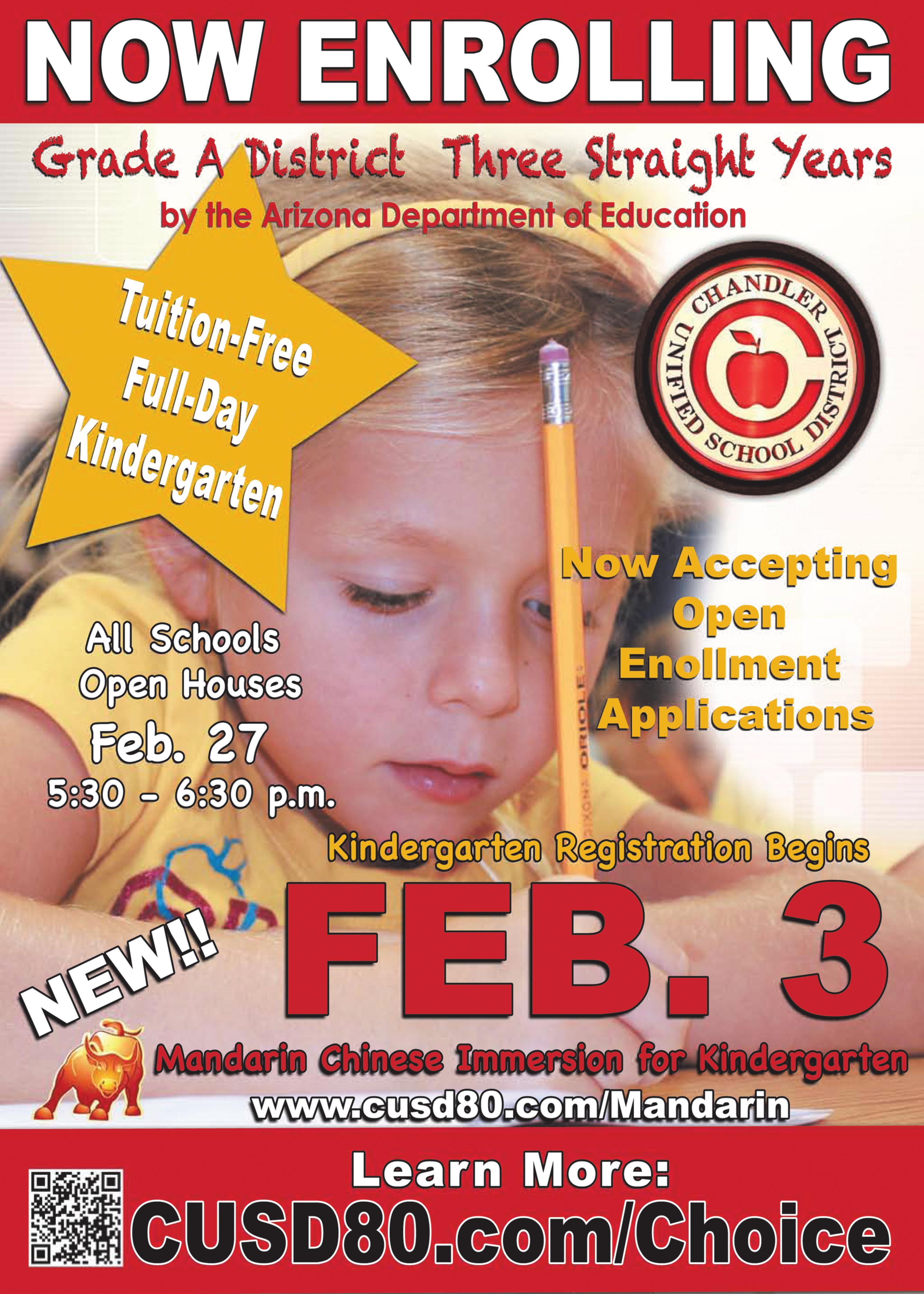 Kindergarten registration –Kindergarten registration for the 2014-15 school year begins Feb. 3. To be eligible, students must turn 5 years old by Aug. 31. Parents can stop by the school office between 7:30 a.m. and 4 p.m. to register their children, bringing a certified copy of the children’s birth certificate, immunization record and proof of address, such as a city of Chandler utility bill, SRP bill, lease or rental agreement or home contract. The last DPT and polio vaccination must have been received on or after the child’s 4th birthday.