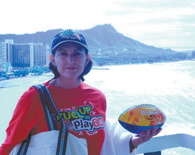 While in Hawaii, Merrill says she and her husband, Sam, met the mascot and a cheerleader from each team, as well as Miss Hawaii. “We got to go to a special party on Saturday night and they had a band. There was a block party outside the hotel that the whole city came too. They had food and NFL paraphernalia, and