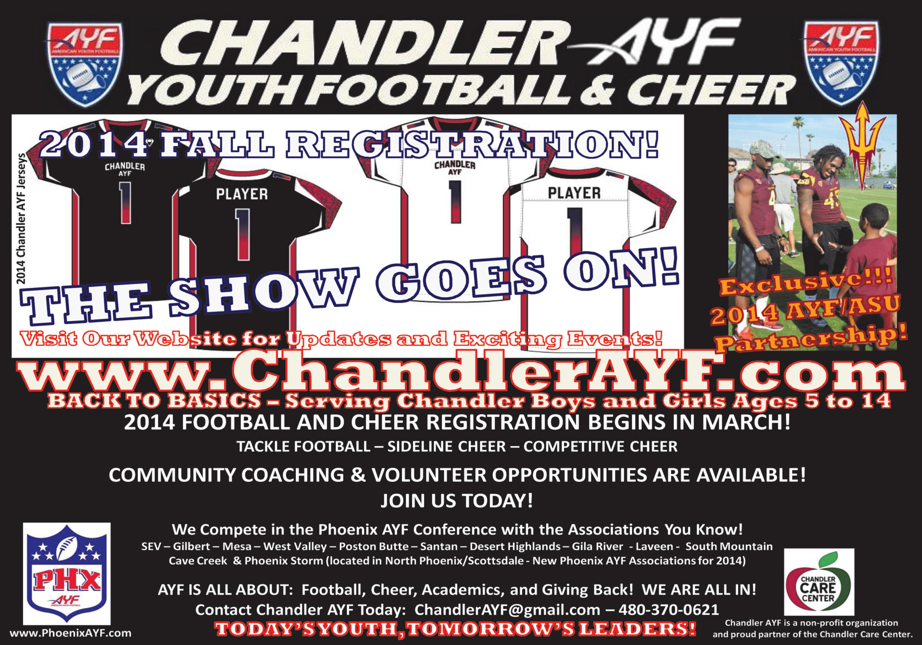 There are several programs offered: tackle football (ages 5-14), sideline cheerleading (ages 5-14) and competitive cheerleading (ages 8-15). Chandler AYF Youth Football and Cheer competes in the Phoenix AYF Conference.