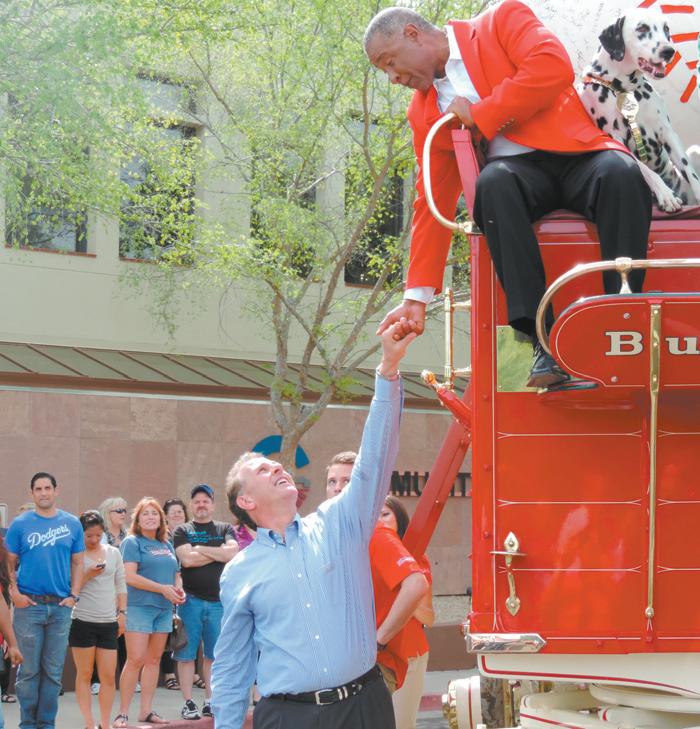 Downtown Chandler was transformed into a production set when Hall of Fame shortstop Ozzie Smith and the worldrenowned Budweiser Clydesdales, with a little help from Coach and Willie’s, worked to persuade baseball fans to sign a petition to make Opening Day a holiday.