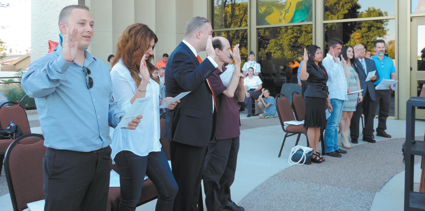 UNITED STATES CITIZENS: Nine people, from eight countries, became naturalized United States Citizens to thundering applause in a ceremony April 8 at the Chandler Center for the Arts.